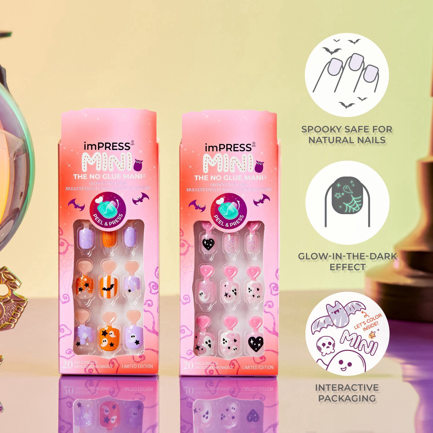 Give your little ghoul a spook-tacular mani with imPRESS Mini Halloween Press On Nails! These glow-in-the-dark no glue nails are frightfully fun and safe for tiny hands. They go on in minutes with zer…