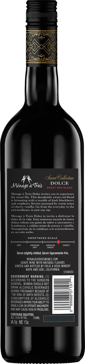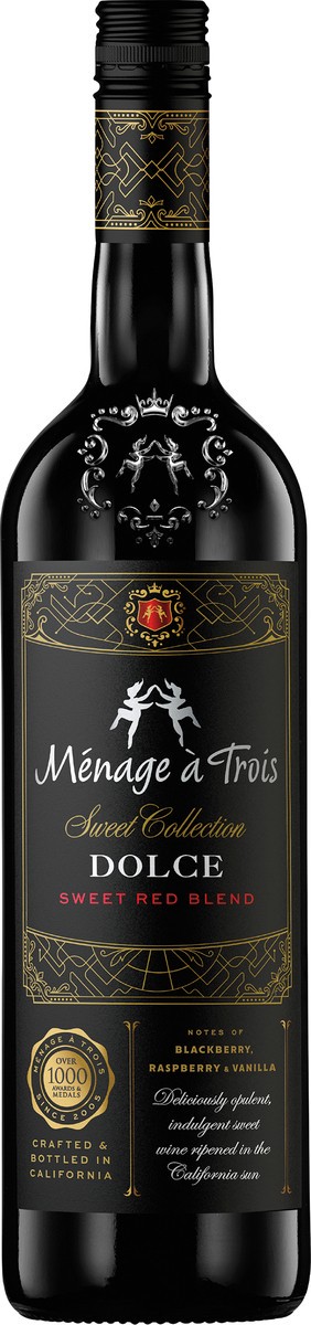 Sweet Red Blend Sweet collection. Sweet red blend. Notes of blackberry, raspberry & vanilla. Deliciously opulent, indulgent sweet wine ripened in the California sun. Menage A Trois Dolce invites you t…