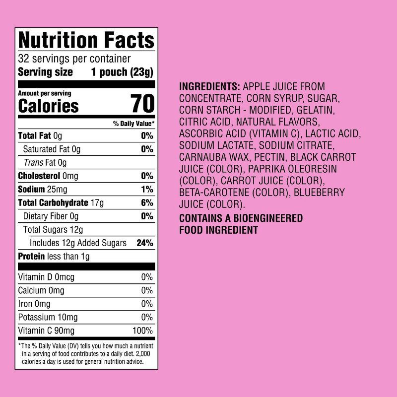 APPLE JUICE FROM CONCENTRATE, CORN SYRUP, SUGAR, CORN STARCH - MODIFIED, GELATIN, CITRIC ACID, NATURAL FLAVORS, ASCORBIC ACID (VITAMIN C), LACTIC ACID, SODIUM LACTATE, SODIUM CITRATE, CARNAUBA WAX, PE…