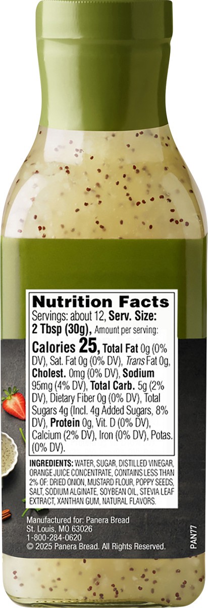Water, Sugar, Distilled Vinegar, Orange Juice Concentrate, Contains Less than 2% of: Dried Onion, Mustard Flour, Poppy Seeds, Salt, Sodium Alginate, Soybean Oil, Stevia Leaf Extract, Xanthan Gum, Natu…