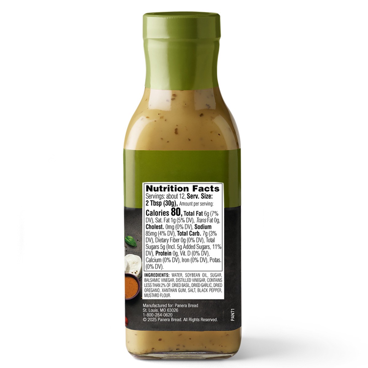 Water, Soybean Oil, Sugar, Balsamic Vinegar, Distilled Vinegar, Contains Less than 2% of: Dried Basil, Dried Garlic, Dried Oregano, Xanthan Gum, Salt, Black Pepper, Mustard Flour.