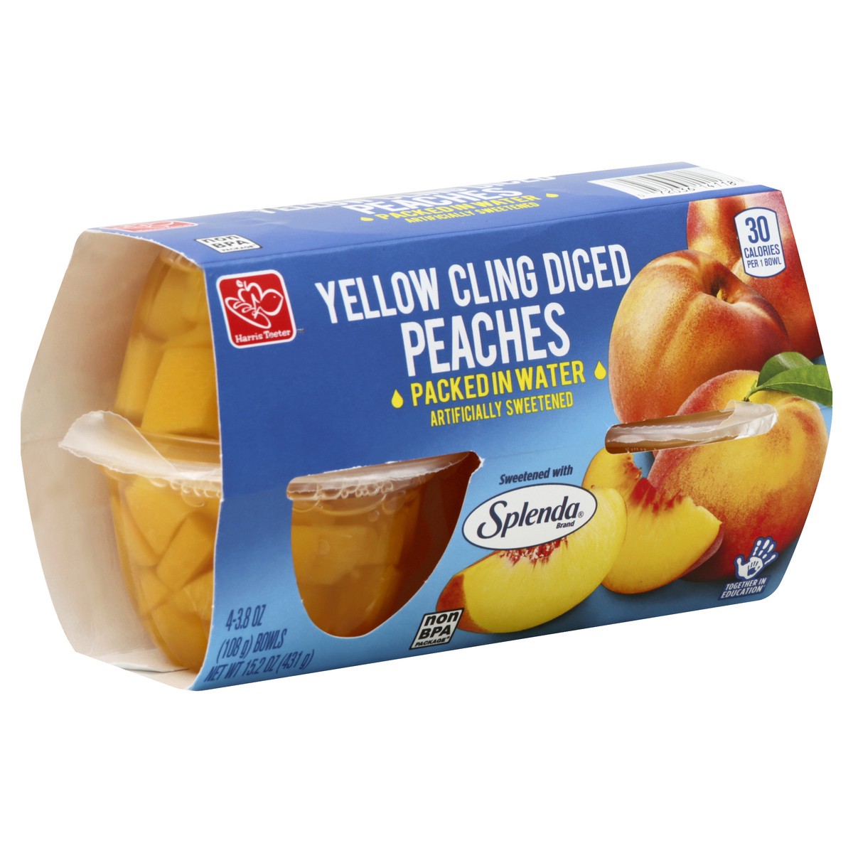 Packed in water. Artificially sweetened. 30 calories per 1 bowl. Sweetened with Splenda. Non BPA package (This package was produced without BPA). Together in Education. 1-800-432-6111 or harristeeter.…