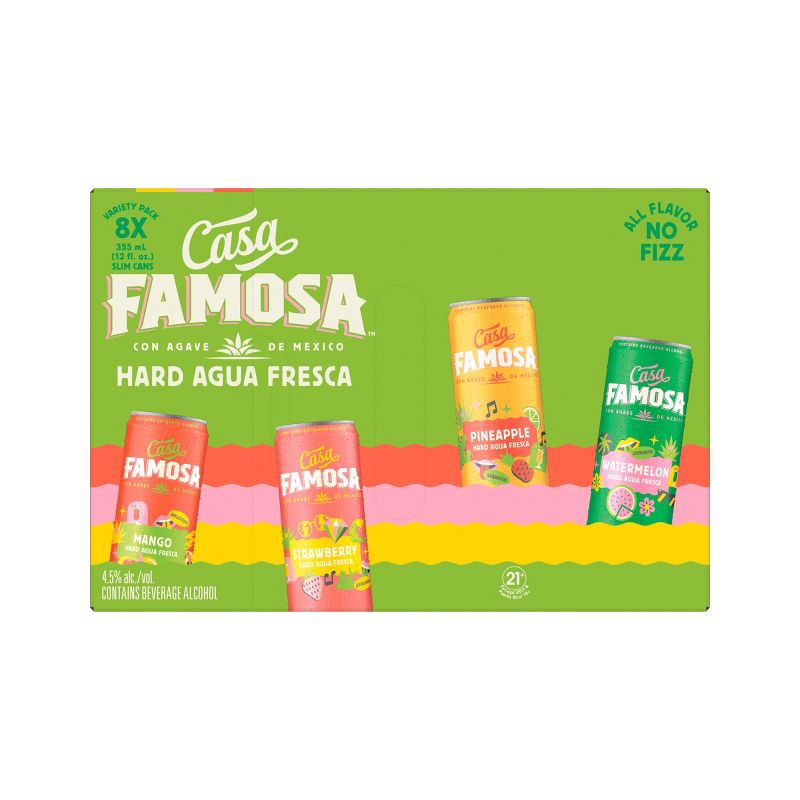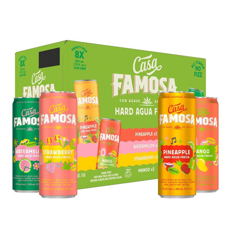 - Includes two 9 proof 355 mL cans of each: Pineapple, Mango, Watermelon, and Strawberry9 proof / 4.5% ABVFor backyard hangs, house parties, or any moment you want to make feel a little more famousBest enjoyed chilled straight from the can with your crowdReal agua fresca flavor, fizz-free and bursting with vibrant, juicy taste. Ready to stand outEvery Casa Famosa Hard Agua Fresca is mixed with premium Mexican agave spirit, fresh fruity flavors, and water to create bold, refreshing tasting drinks that co-star any moment with you and your crewBest enjoyed chilled straight from the can with your crowd