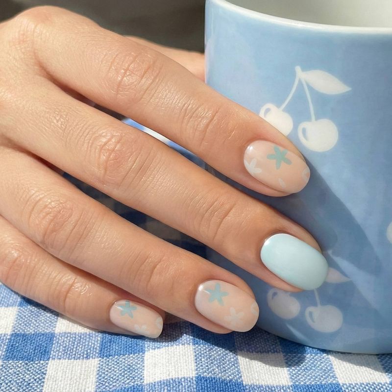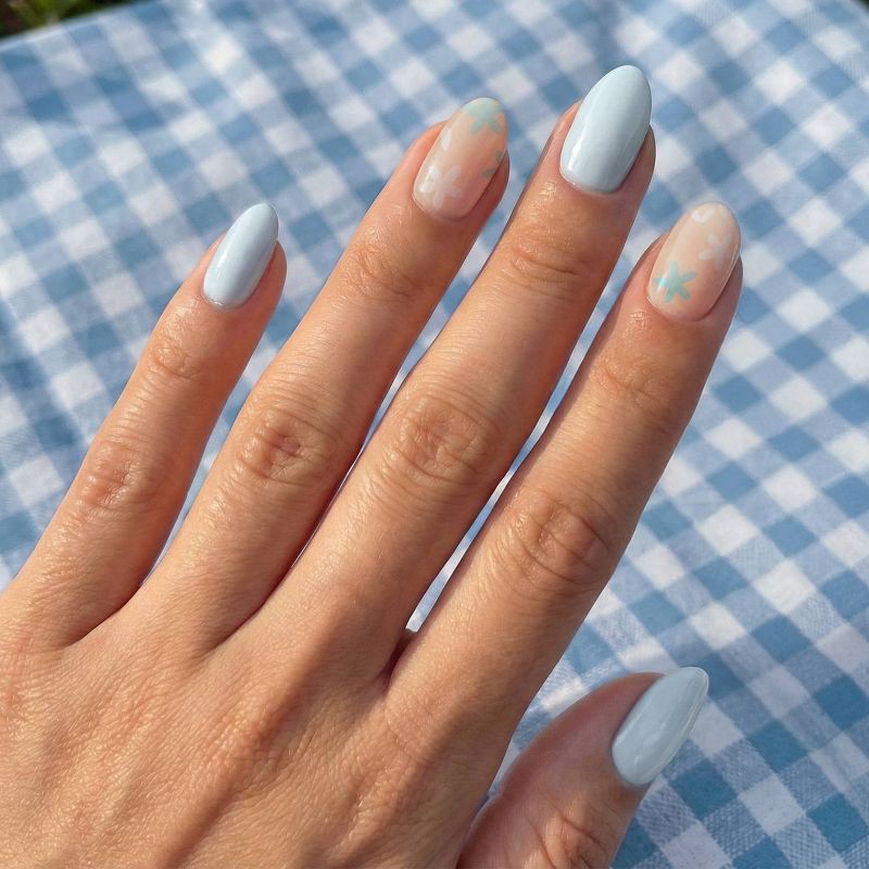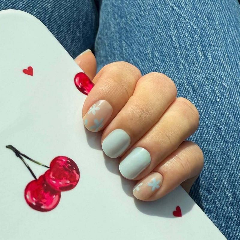 Soft florals meet festival chic. This pastel blue and nude set, sprinkled with dreamy daisies, is perfect for those sun-soaked days, boho outfits, and dancing till sunset. 60% semi-cured gel nail stic…
