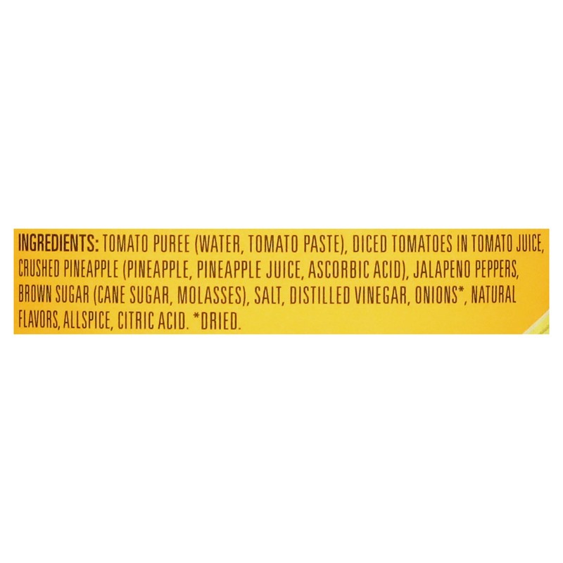 Tomato Puree (Water, Tomato Paste), Diced Tomatoes in Tomato Juice, Crushed Pineapple (Pineapple, Pineapple Juice, Ascorbic Acid), Jalapeno Peppers, Brown Sugar (Cane Sugar, Molasses), Salt, Distilled…