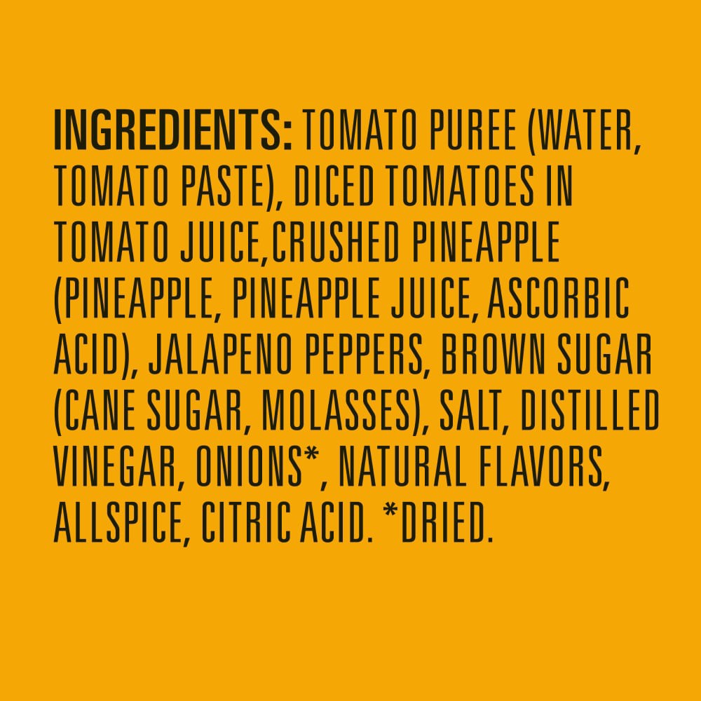 Tomato Puree (Water, Tomato Paste), Diced Tomatoes in Tomato Juice, Crushed Pineapple (Pineapple, Pineapple Juice, Ascorbic Acid), Jalapeno Peppers, Brown Sugar (Cane Sugar, Molasses), Salt, Distilled…