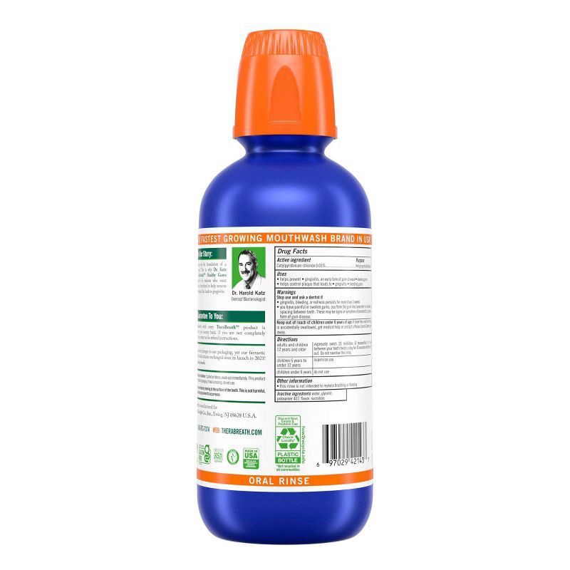 - One 16 fl oz bottle of TheraBreath Healthy Gums Oral Rinse in a Clean Mint flavor; this antigingivitis, antiplaque mouthwash is dentist formulated and alcohol free
