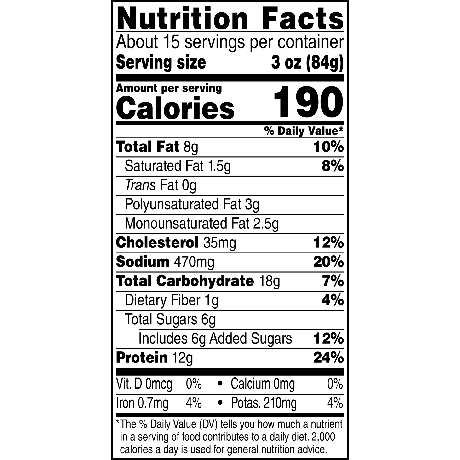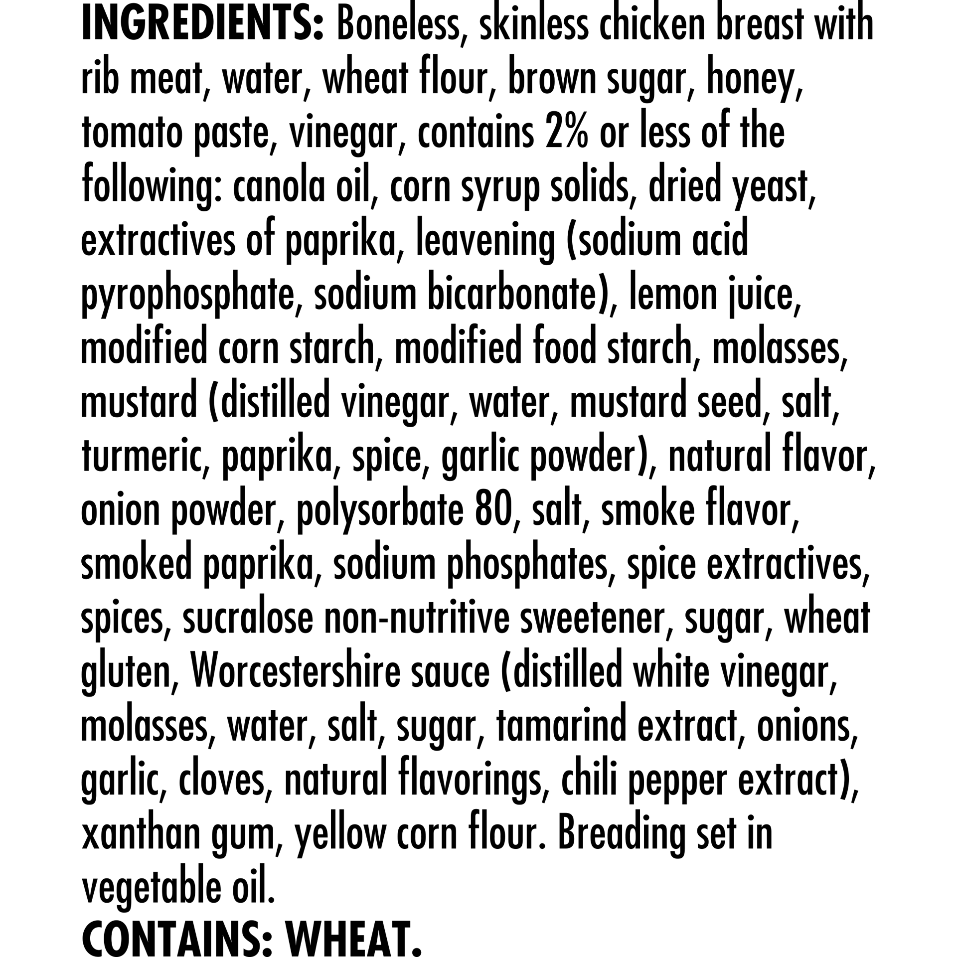 Boneless, skinless chicken breast with rib meat, water, wheat flour, brown sugar, honey, tomato paste, vinegar, contains 2% or less of the following: canola oil, corn syrup solids, dried yeast, extrac…