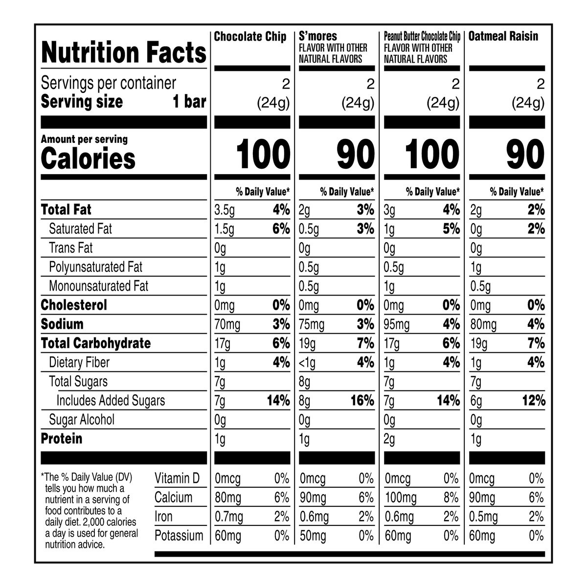 Chocolate Chip Ingredients: Granola (Whole Grain Oats, Brown Sugar, Brown Rice Crisp [Whole Grain Brown Rice Flour, Sugar, Salt], Whole Grain Wheat, Soybean Oil, Coconut, Whole Wheat Flour, Baking Sod…
