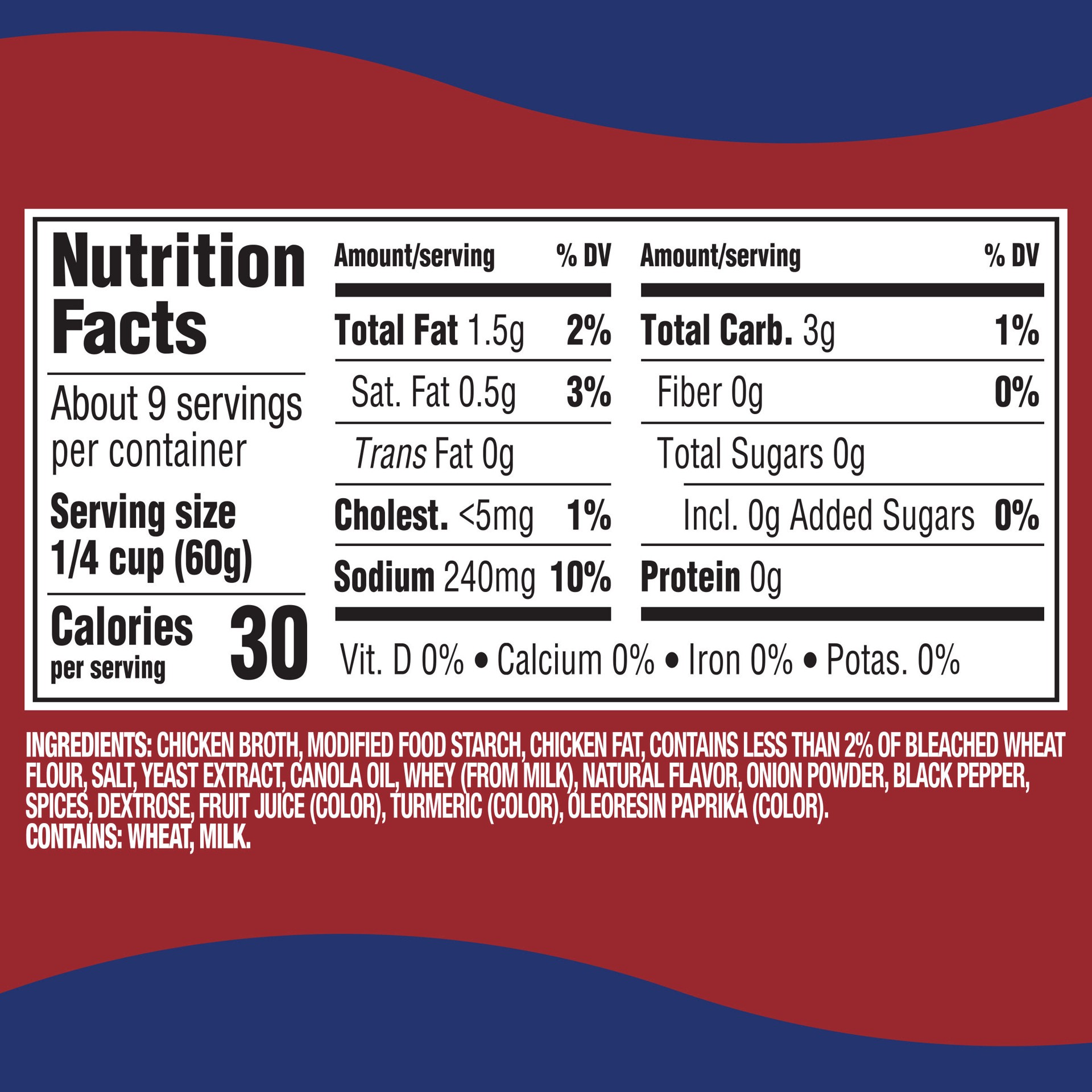 CHICKEN BROTH, MODIFIED FOOD STARCH, CHICKEN FAT, CONTAINS LESS THAN 2% OF BLEACHED WHEAT FLOUR, SALT, YEAST EXTRACT, CANOLA OIL, WHEY (FROM MILK), NATURAL FLAVOR, ONION POWDER, BLACK PEPPER, SPICES, …