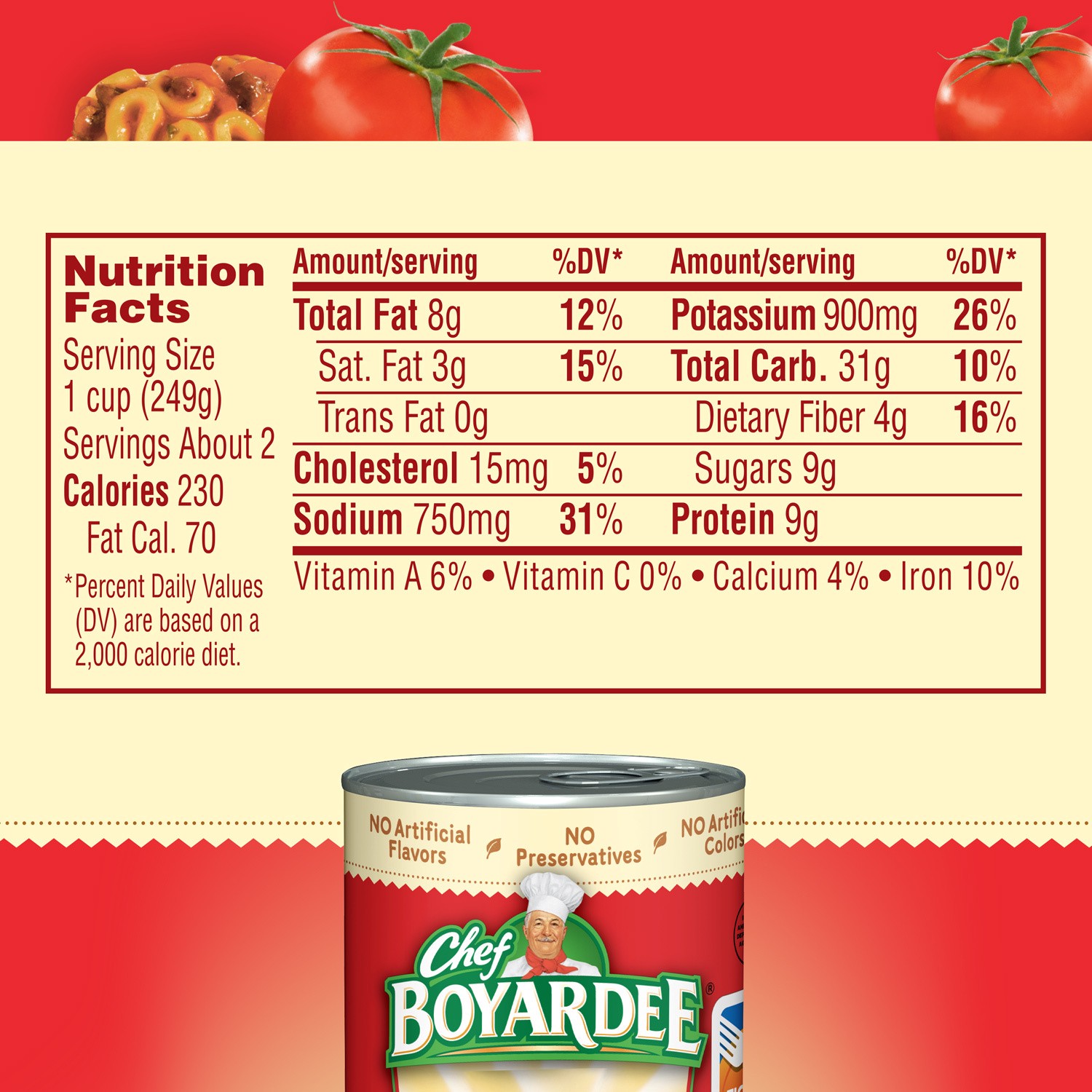Tomatoes (Tomato Puree, Water), Water, Enriched Pasta (Durum Wheat Semolina, Glycerol Monostearate, Niacin, Reduced Iron, Thiamine Mononitrate [Vitamin B1], Riboflavin [Vitamin B2], Folic Acid), Beef,…