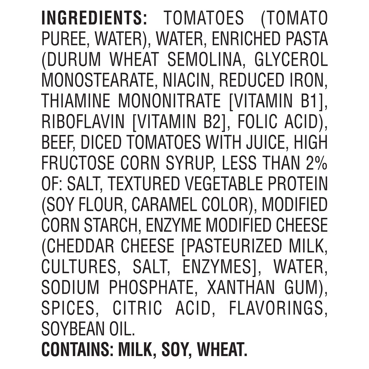 Tomatoes (Tomato Puree, Water), Water, Enriched Pasta (Durum Wheat Semolina, Glycerol Monostearate, Niacin, Reduced Iron, Thiamine Mononitrate [Vitamin B1], Riboflavin [Vitamin B2], Folic Acid), Beef,…