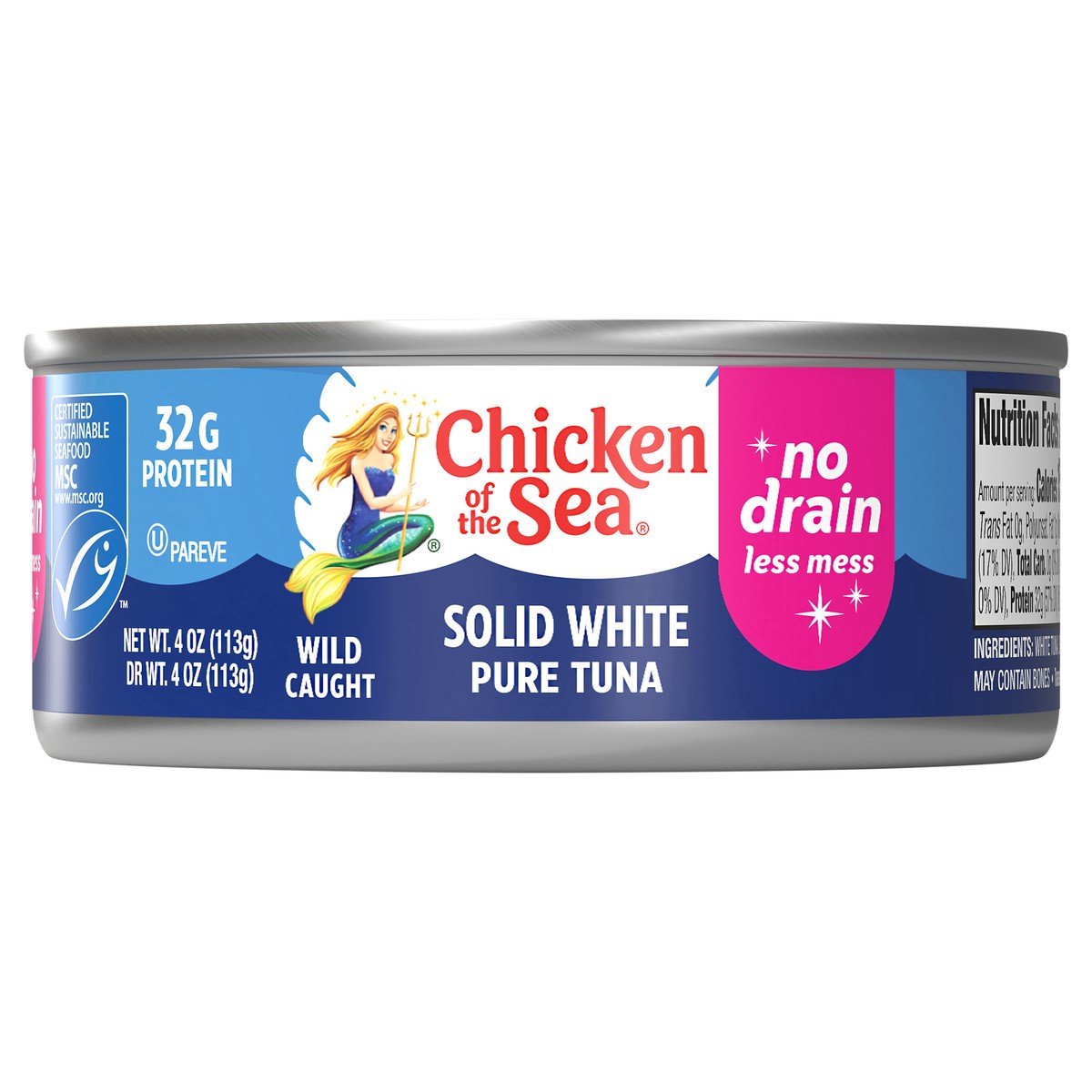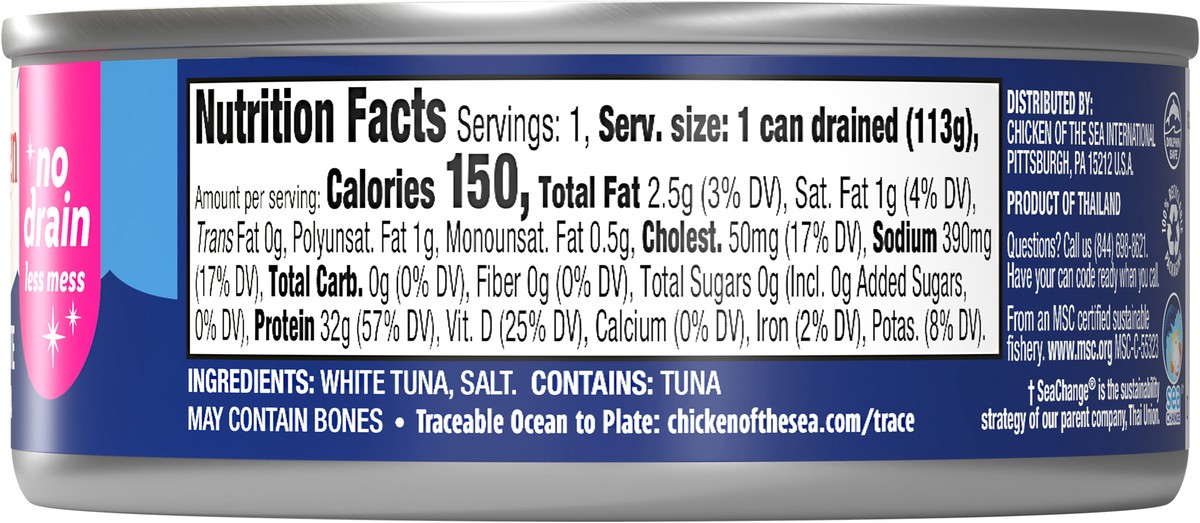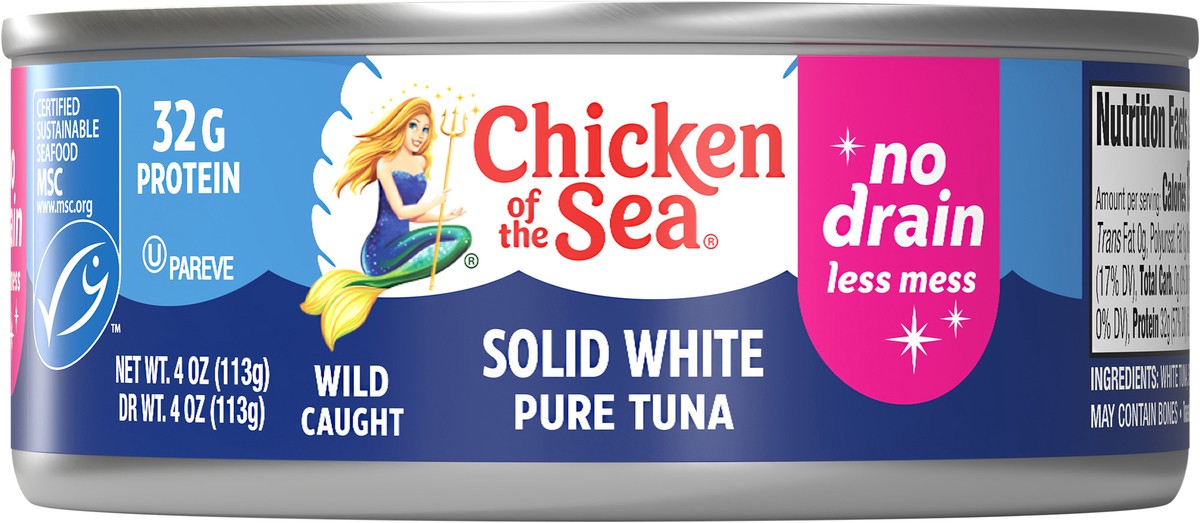 Try out our new Chicken of the Sea® Solid White Albacore Tuna In Water with no need to drain!32 grams of proteinNo drain, less messNo drainer, no brainer