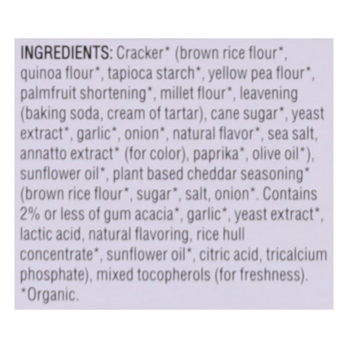 Cracker* (Brown Rice Flour*, Quinoa Flour*, Tapioca Starch*, Yellow Pea Flour*, Palmfruit Shortening*, Millet Flour*, Leavening (Baking Soda, Cream of Tartar), Cane Sugar*, Yeast Extract*, Garlic*, On…