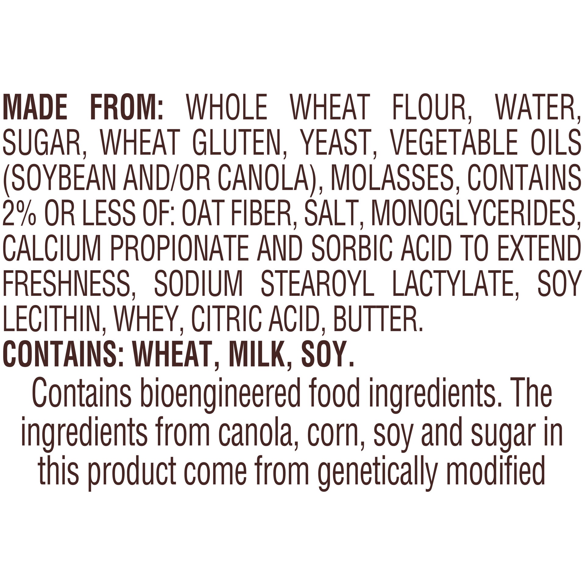 MADE FROM: WHOLE WHEAT FLOUR, WATER, SUGAR, WHEAT GLUTEN, YEAST, VEGETABLE OILS (SOYBEAN AND/OR CANOLA), MOLASSES, CONTAINS 2% OR LESS OF: OAT FIBER, SALT, MONOGLYCERIDES, CALCIUM PROPIONATE AND SORBI…