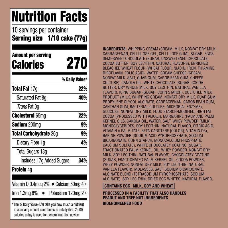 WHIPPING CREAM (CREAM, MILK, NONFAT DRY MILK, CARRAGEENAN, CELLULOSE GEL, CELLULOSE GUM), SUGAR, EGGS, SEMI-SWEET CHOCOLATE (SUGAR, UNSWEETENED CHOCOLATE, COCOA BUTTER, SOY LECITHIN, NATURAL FLAVORS),…