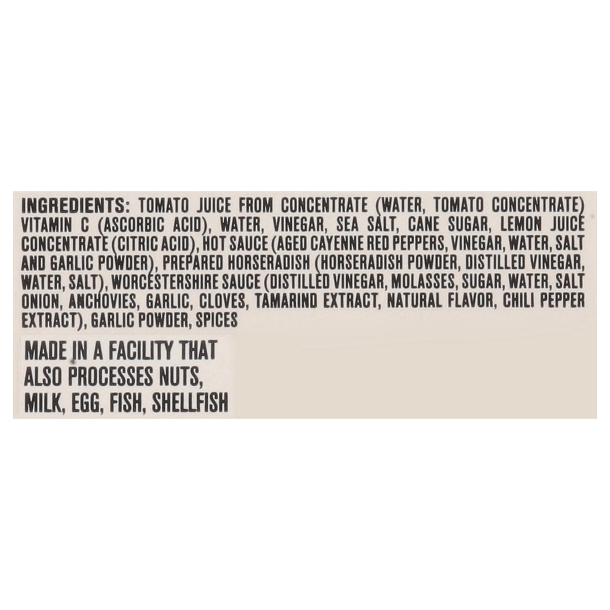 Tomato Juice from Concentrate (Water, Tomato Concentrate) Vitamin C (Ascorbic Acid), Water, Vinegar, Sea Salt, Cane Sugar, Lemon Juice Concentrate (Citric Acid), Hot Sauce (Aged Cayenne Red Peppers, V…