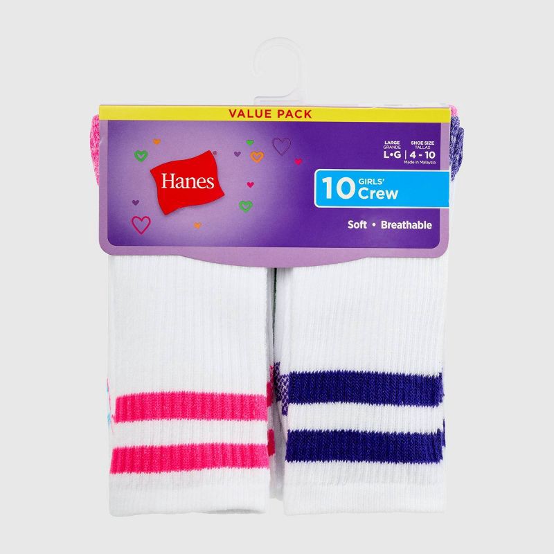 - VALUE YOU LOVE - Stock up and simplify laundry days with a convenient 10-pair pack of girls' crew socks, giving her plenty of fresh options for school, sports, and weekends while delivering the trusted value parents expect from Hanes.