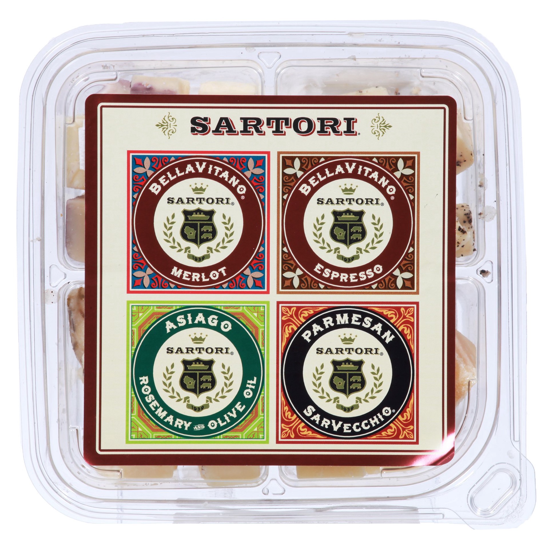Sartori Four Cheese Cubes Variety, sold by the pound.-Includes: Bella Vitano Espresso, Bella Vitano Merlot, Asiago with Rosemary, and Parmesan.