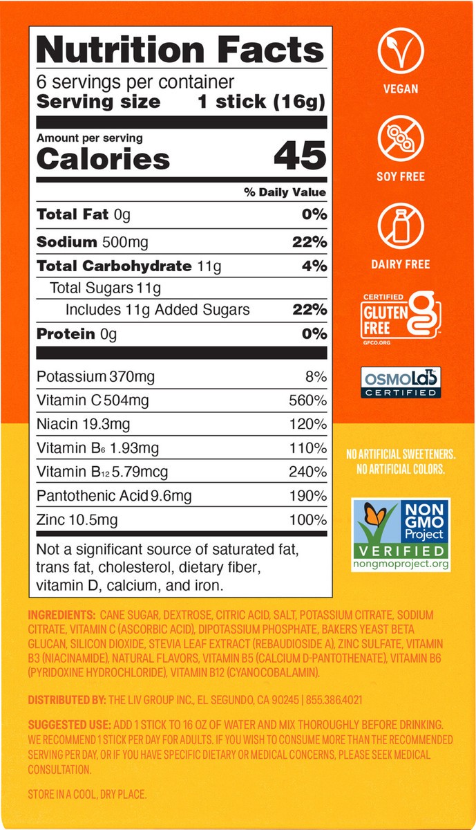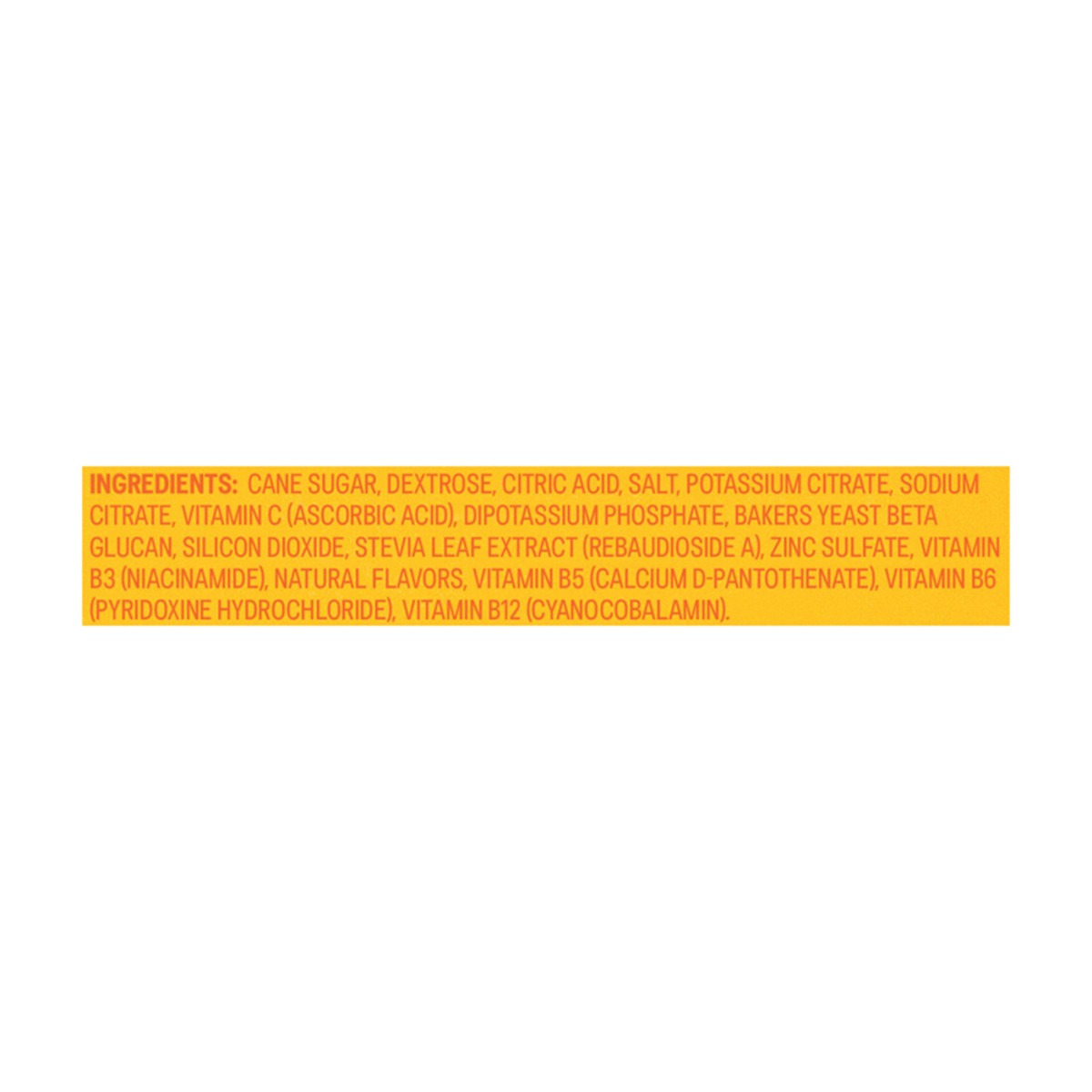 Cane Sugar, Dextrose, Citric Acid, Salt, Potassium Citrate, Sodium Citrate, Vitamin C (Ascorbic Acid), Dipotassium Phosphate, Bakers Yeast Beta Glucan, Silicon Dioxide, Stevia Leaf Extract (Rebaudiosi…