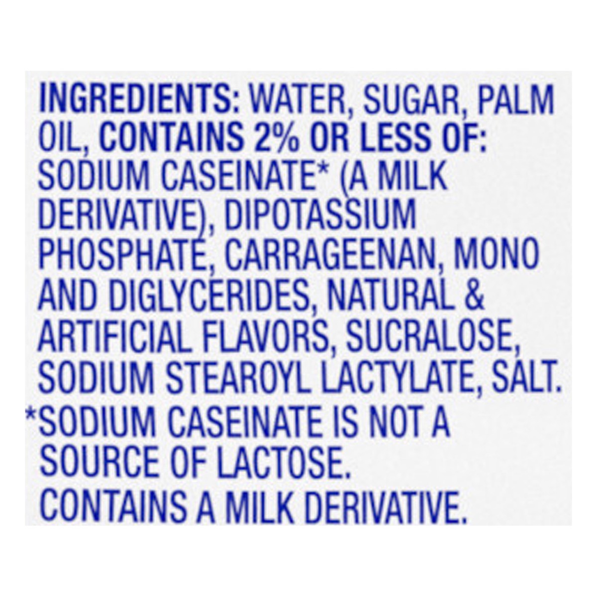 INGREDIENTS: Water; Sugar; Palm Oil; Contains 2% or less of: Sodium Caseinate* (A Milk Derivative); Dipotassium Phosphate; Carrageenan; Mono and Diglycerides; Natural & Artificial Flavors; Sucralo…