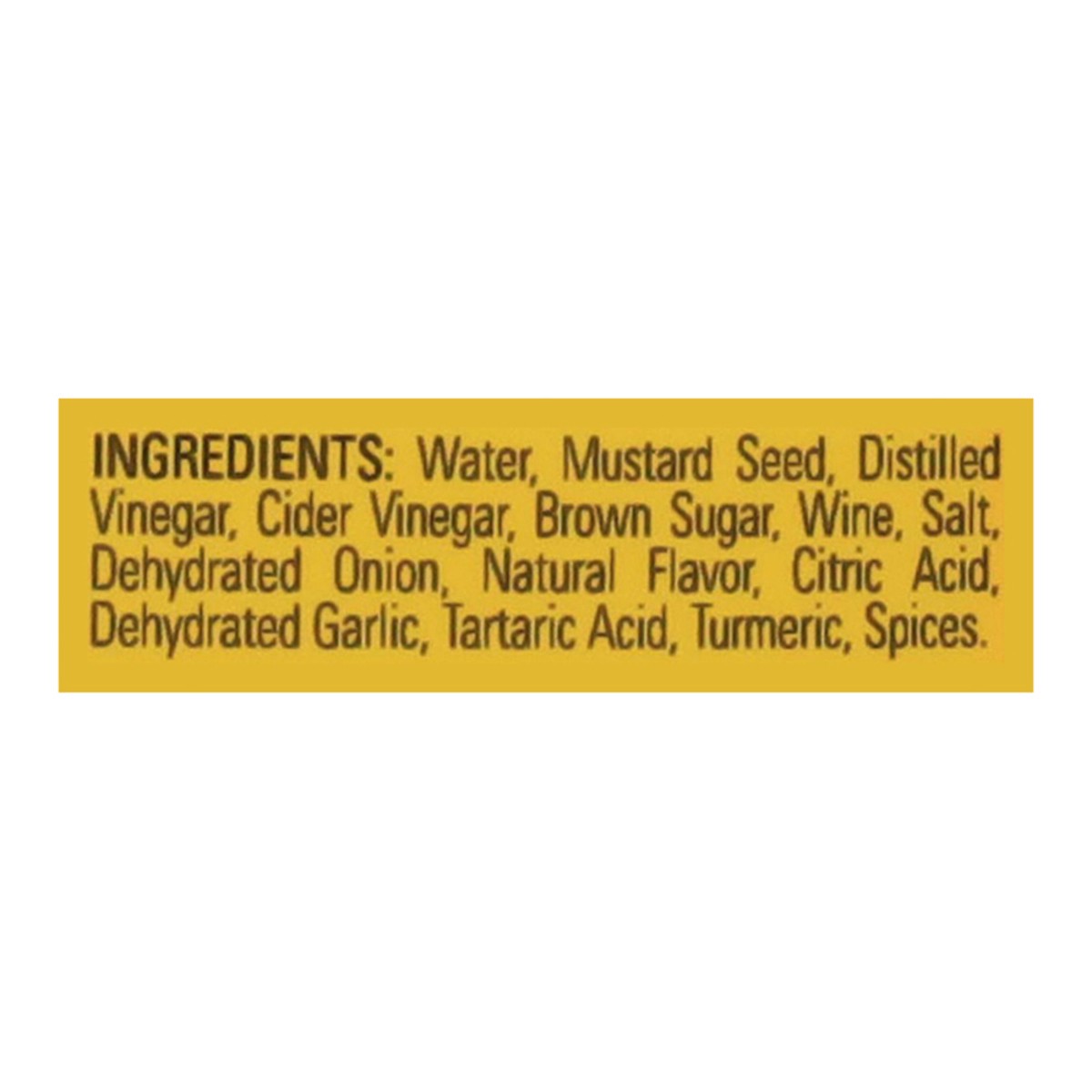 Water, Mustard Seed, Distilled Vinegar, Cider Vinegar, Brown Sugar, Wine, Salt, Dehydrated Onion, Natural Flavor, Citric Acid, Dehydrated Garlic, Tartaric Acid, Turmeric, Spices.