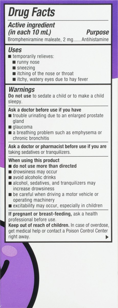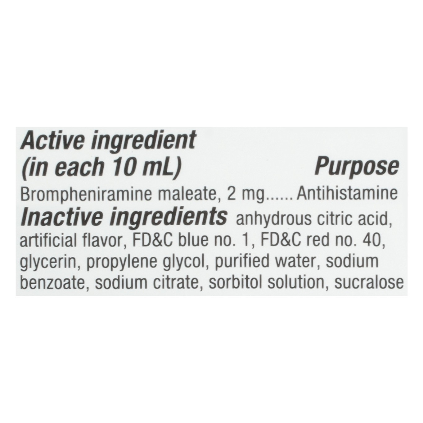 In Each 10 mL: Active Ingredients: Brompheniramine Maleate (2 mg), Antihistamine. Inactive Ingredients: Anhydrous Citric Acid, Artificial Flavor, FD&C Blue 1, FD&C Red 40, Glycerin, Propylene Glycol, …