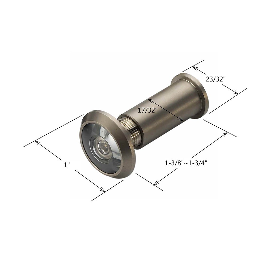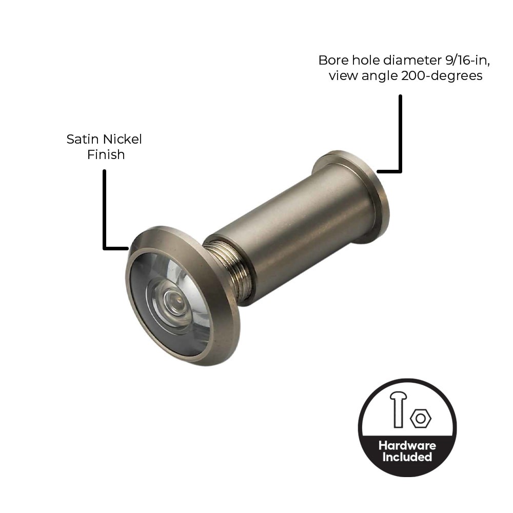 Bore hole diameter 9/16-in. Value item. Easy to install. Basic hardware. Satin nickel. Wide-angle optical lens provides enhanced entryway visibility. Durable, corrosion-resistant construction suited f…