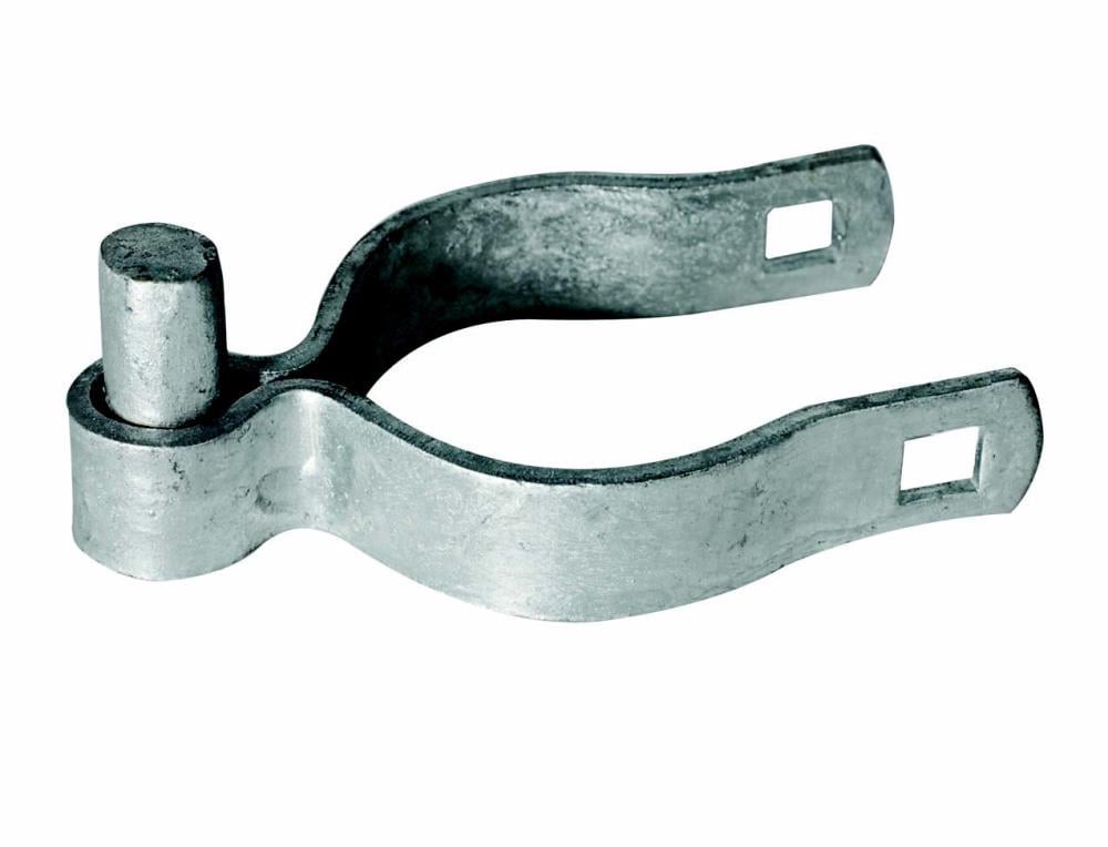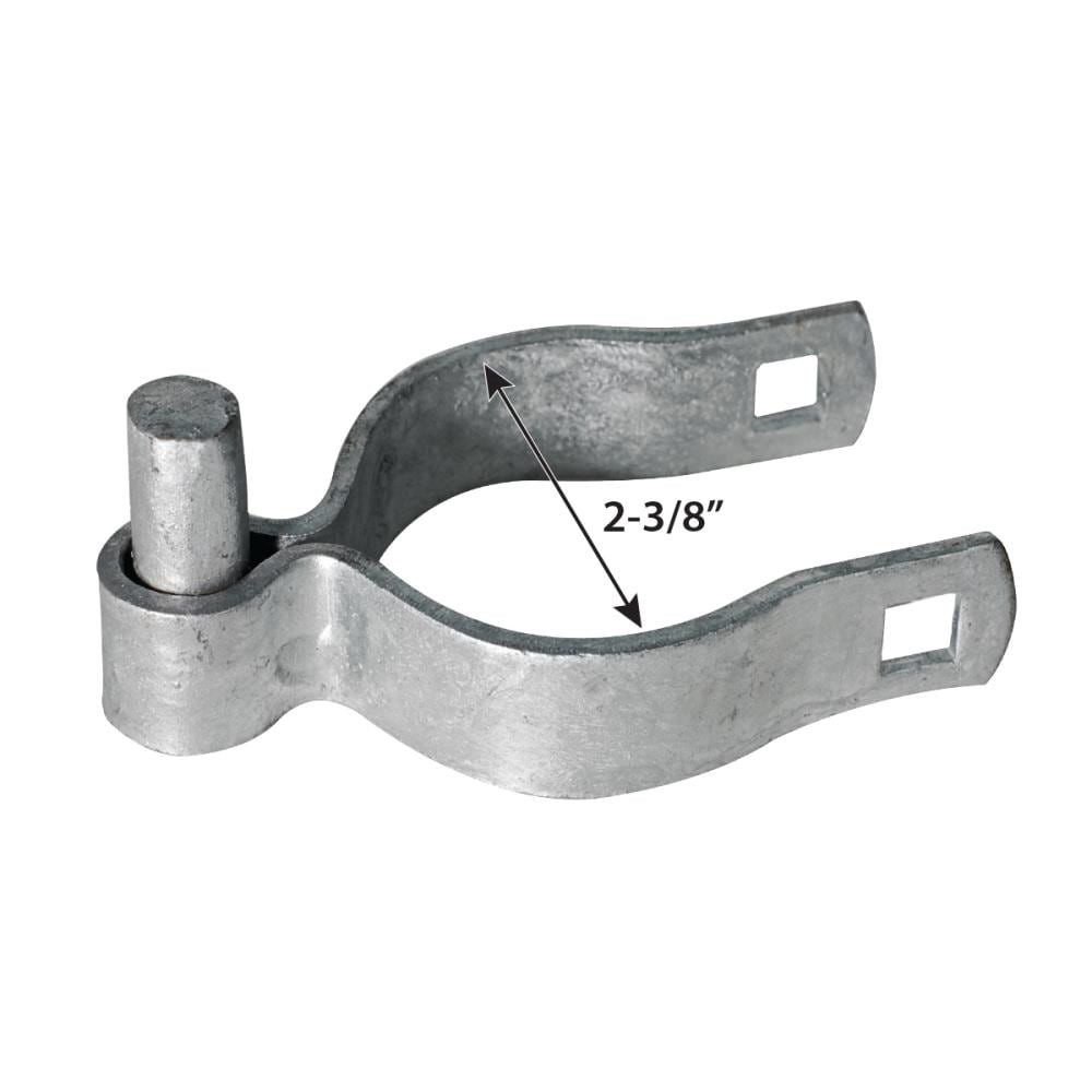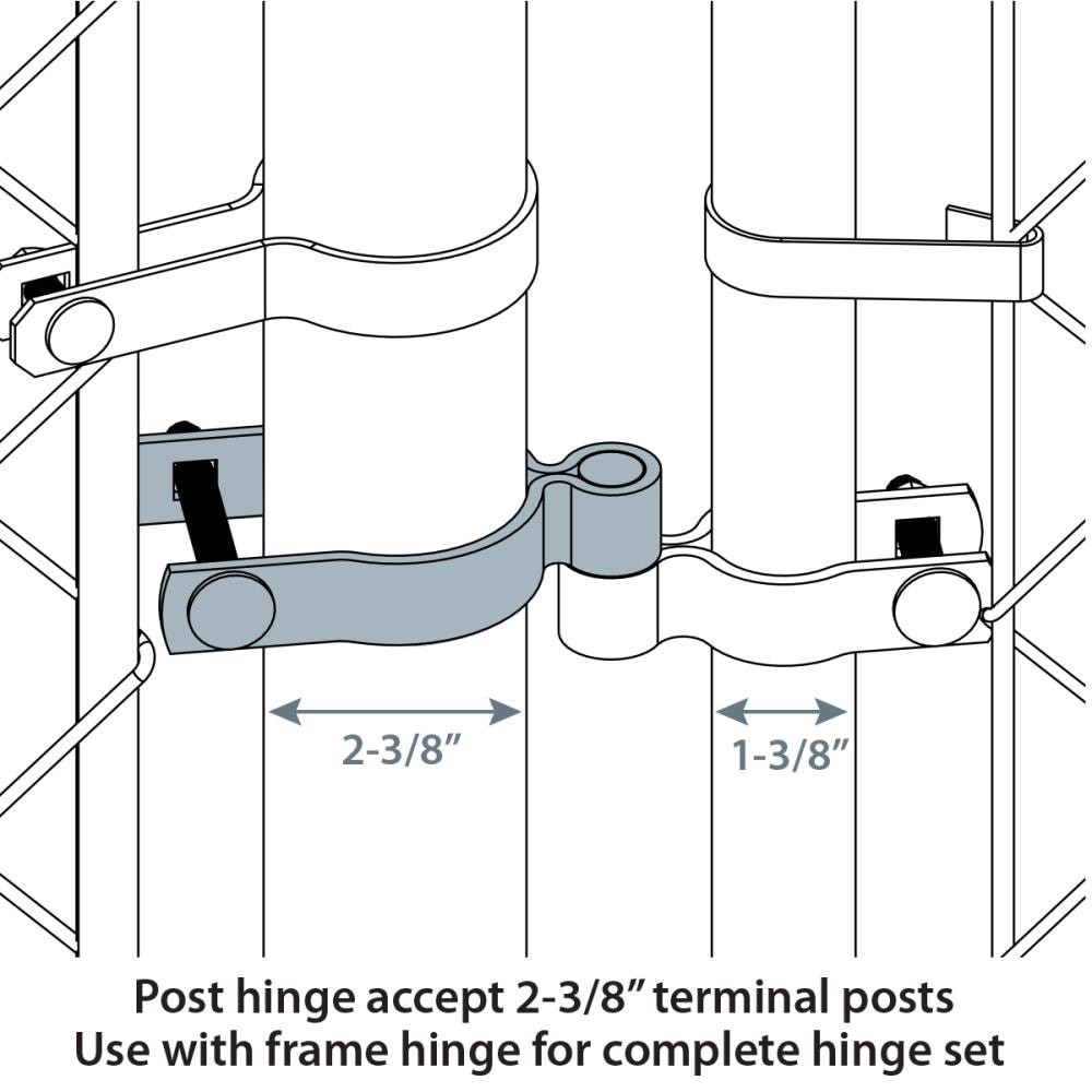 Attaches to the terminal or gate posts. Must be used in conjunction with the frame hinge (sold separately). Allows gate to open and close. For use with 2-3/8in posts. Galvanized for weather and corros…
