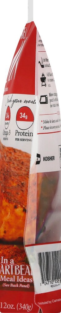 Boneless skinless portions. 2.4 g DHA + EPA Omega-3 per serving. 34 g protein per serving. Ocean raised. Nourished your world. Quick & Easy: 4 min each side. In a heartbeat meal ideas (see back label)…