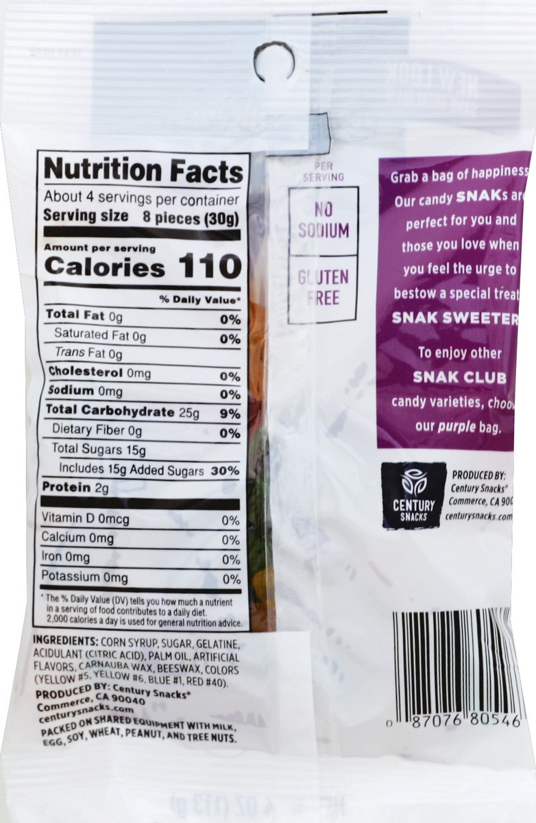 Corn Syrup, Sugar, Gelatin, Citric Acid, Palm Oil, Artificial Flavors, Carnauba Wax, Beeswax, FD&C Yellow 5, Yellow 6, Blue 1, Red 40.