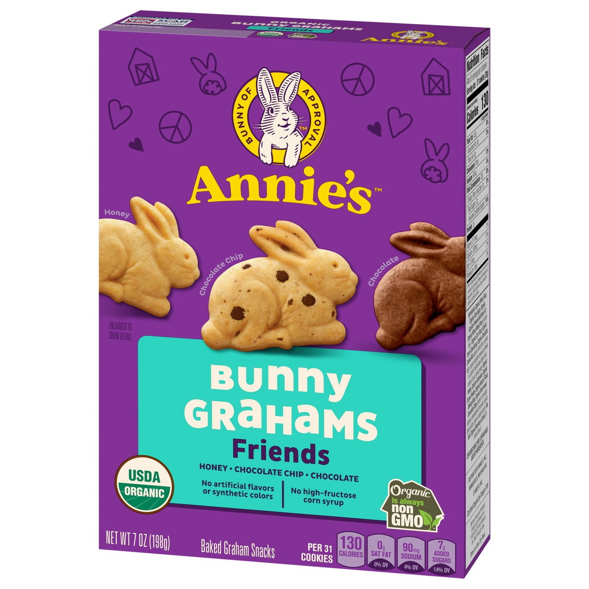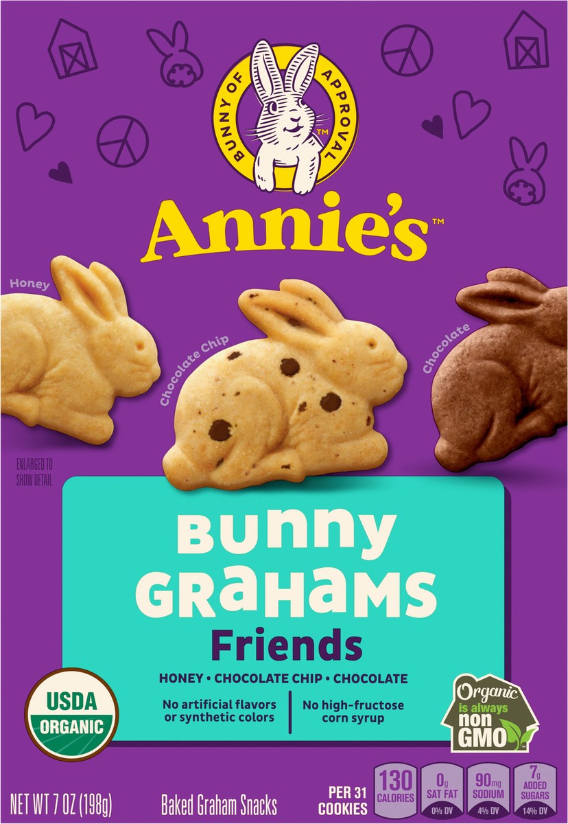 Honey, chocolate & chocolate chip bunny graham friends. All natural graham snacks. No icky additives or pesky preservatives.