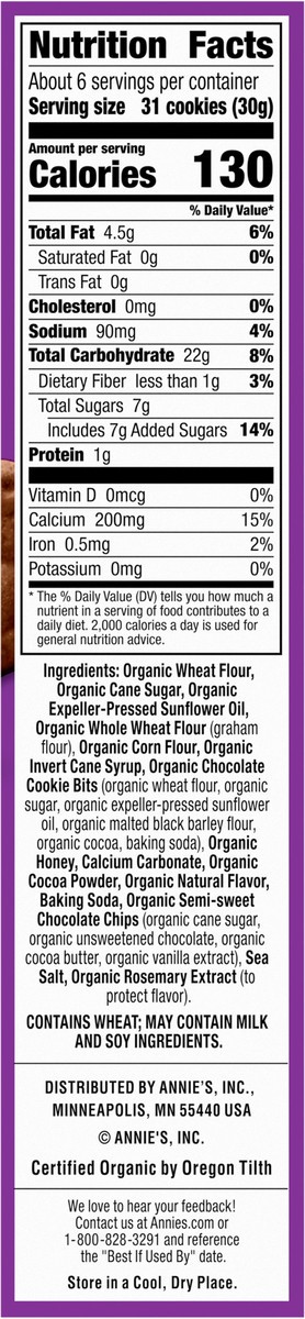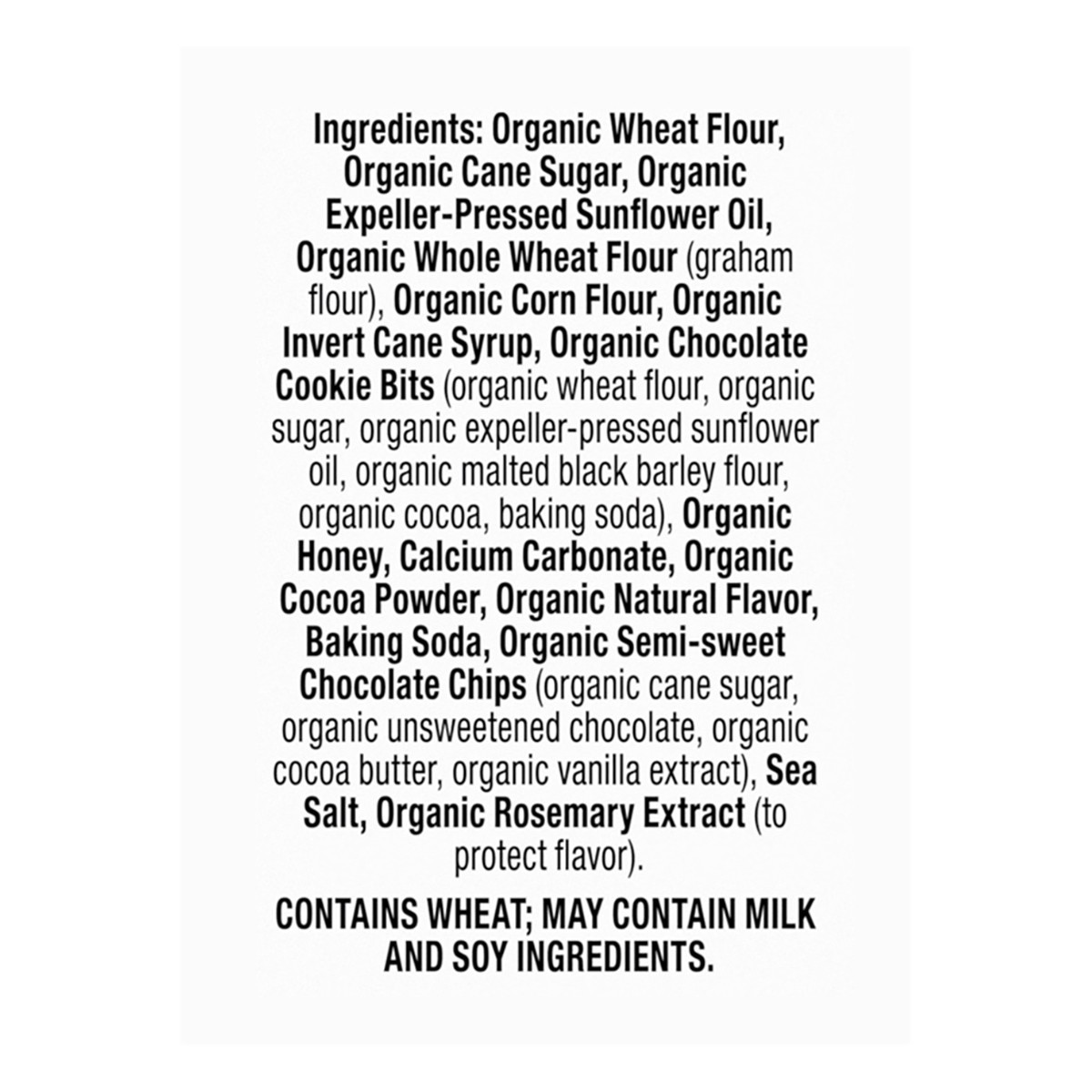 Organic Wheat Flour, Organic Cane Sugar, Organic Expeller-Pressed Sunflower Oil, Organic Whole Wheat Flour (Graham Flour), Organic Corn Flour, Organic Invert Cane Syrup, Organic Chocolate Cookie Bits …