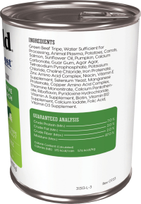 GREEN BEEF TRIPE, BEEF BROTH, POTATOES, CANOLA OIL, TRICALCIUM PHOSPHATE, SALT, CASSIA GUM, XANTHAN GUM, POTASSIUM CHLORIDE, CHOLINE CHLORIDE, ZINC PROTEINATE, IRON PROTEINATE, VITAMIN E SUPPLEMEN, CO…