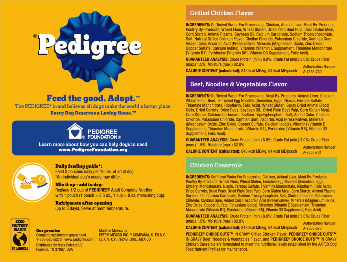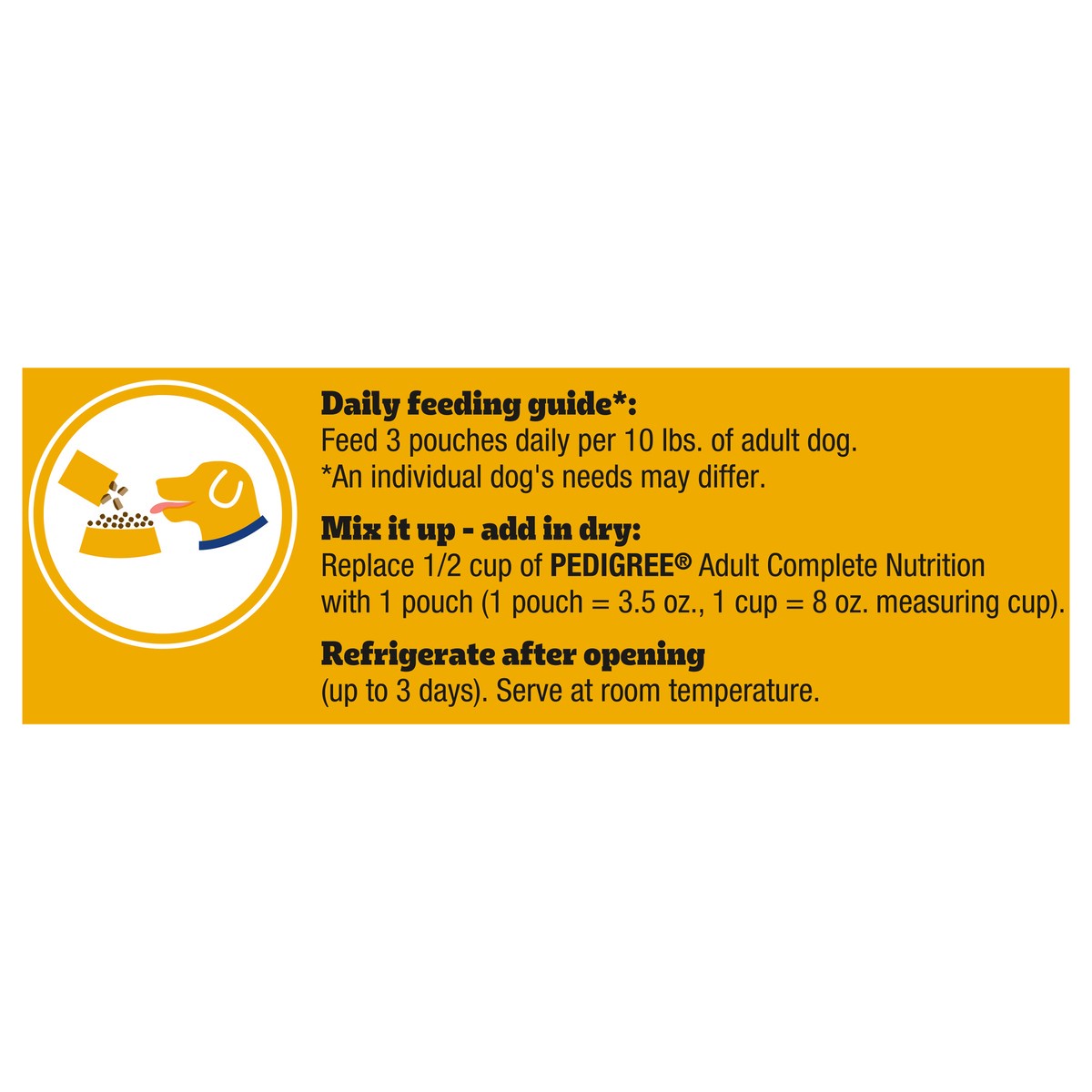 Mix it up - Add in dry. Replace 1/2 cup of Pedigree Adult Complete Nutrition with 1 pouch (1 pouch = 3.5 oz, 1 cup = 8 oz measuring cup). Daily Feeding Guide (An individual dog's need may differ): Fee…
