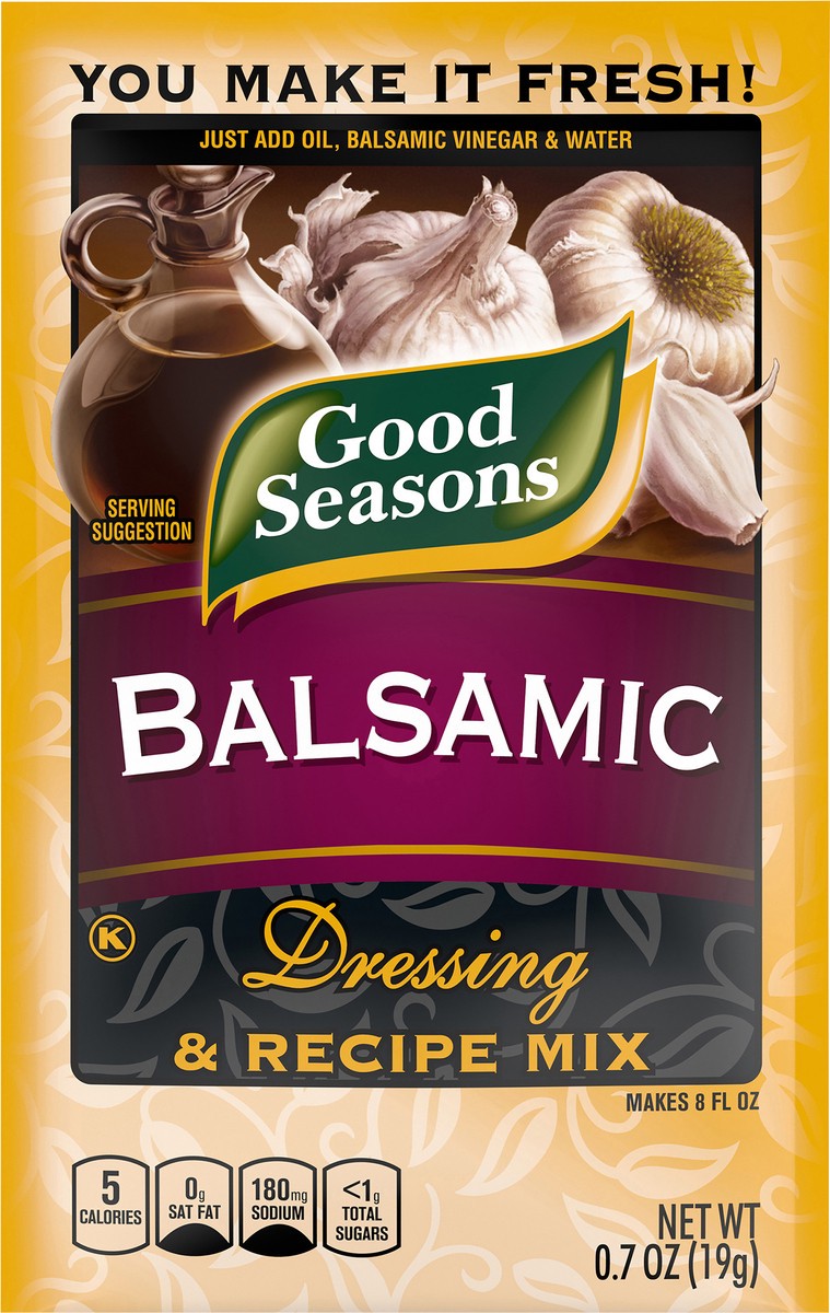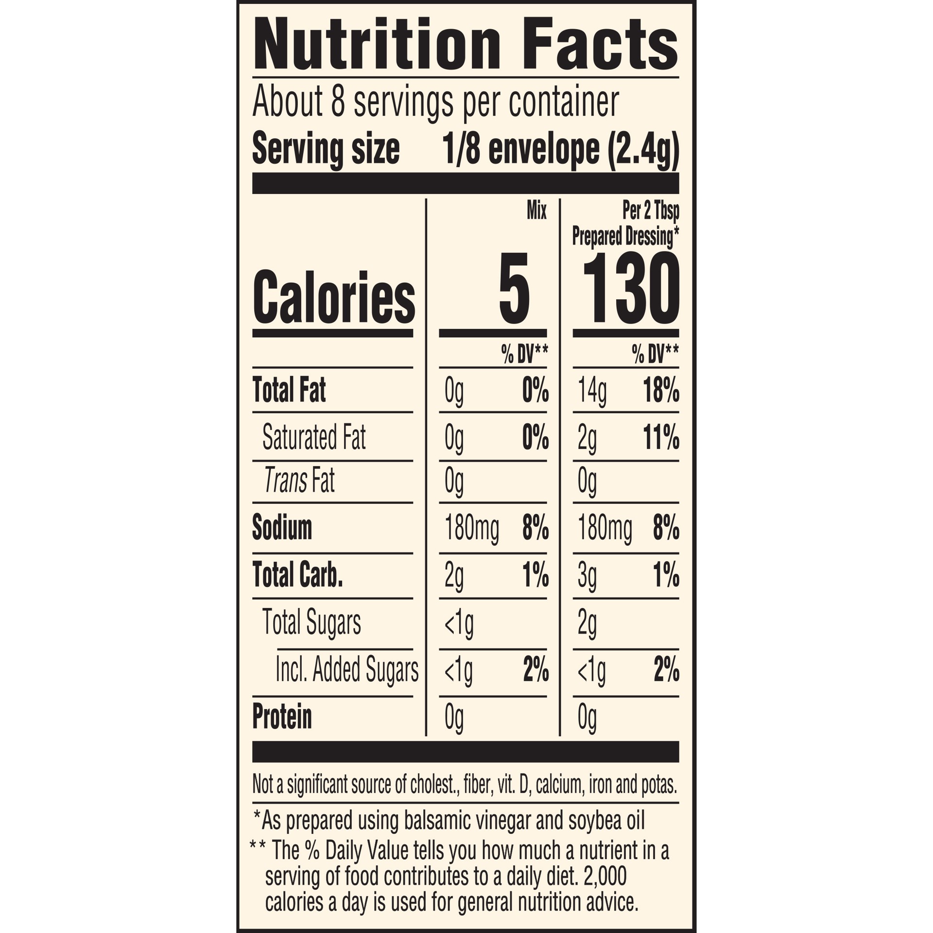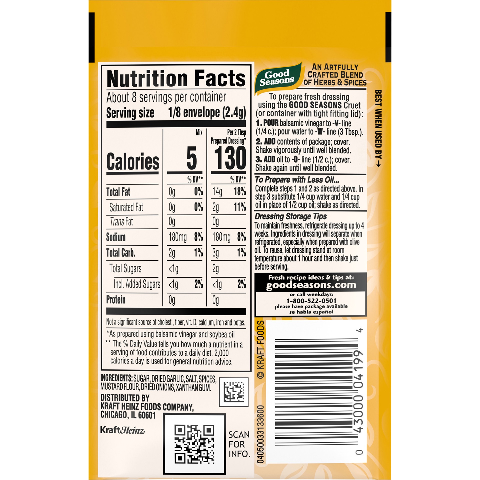 5 calories; 0 g sat fat; 180 mg sodium; less than 1 g total sugars. You make it fresh! Just add oil, balsamic, vinegar & water. Makes 8 fl oz. An artfully crafted blend of herbs & spices. goodseasons.…
