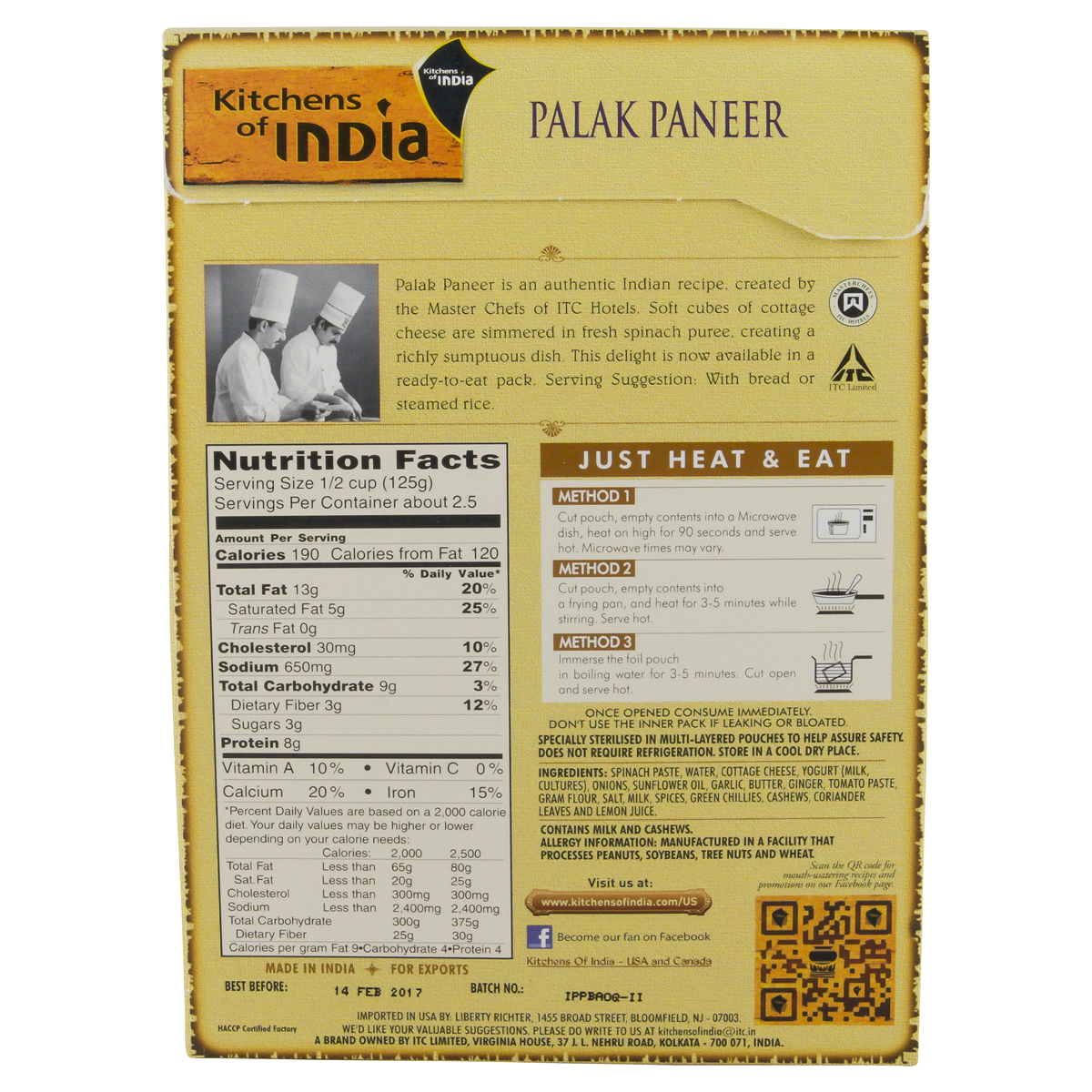 Spinach, Cottage Cheese, Yogurt (Milk, Cultures), Onions, Sunflower Oil, Garlic, Water, Butter, Tomato Paste, Ginger, Gram Flour, Milk, Salt, Spices, Green Chillies, Cashews, Lemon Juice, Coriander Le…