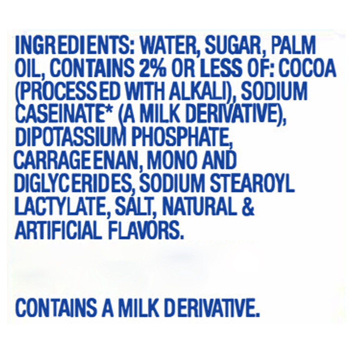Water, Sugar, Palm Oil, Contains 2% or Less of: Cocoa (Processed with Alkali), Sodium Caseinate* (a Milk Derivative), Dipotassium Phosphate, Carrageenan, Mono and Diglycerides, Sodium Stearoyl Lactyla…