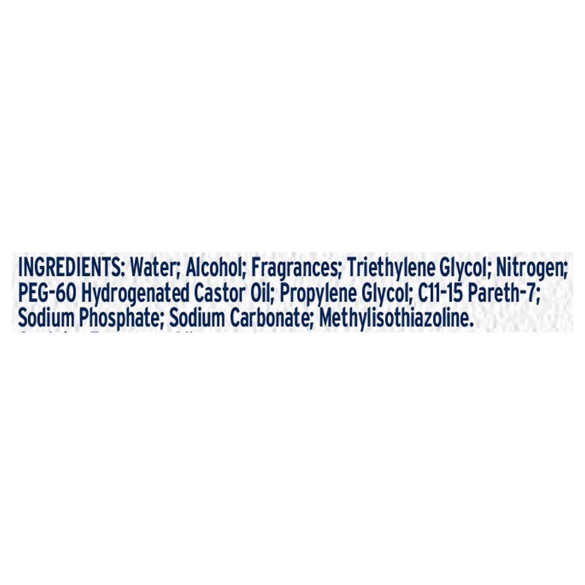 Water; Alcohol; Fragrances; Triethylene Glycol; Nitrogen; PEG-60 Hydrogenated Castor Oil; Propylene Glycol; C11-15 Pareth-7; Sodium Phosphate; Sodium Carbonate; Methylisothiazoline.