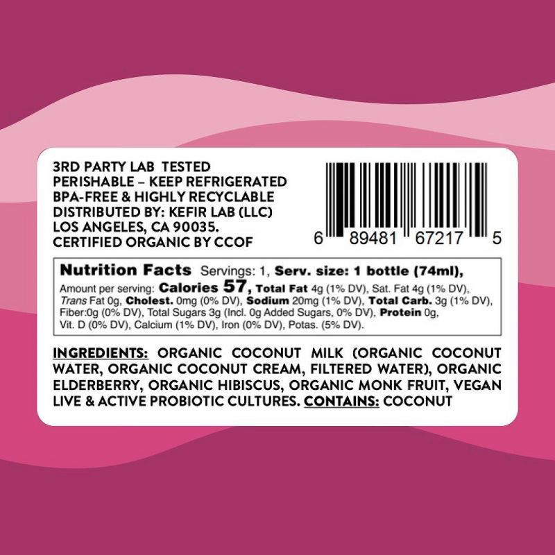 ORGANIC COCONUT MILK (ORGANIC COCONUT WATER, ORGANIC COCONUT CREAM, FILTERED WATER), ORGANIC ELDERBERRY, ORGANIC HIBISCUS, ORGANIC MONK FRUIT, VEGAN LIVE & ACTIVE PROBIOTIC CULTURES.' '