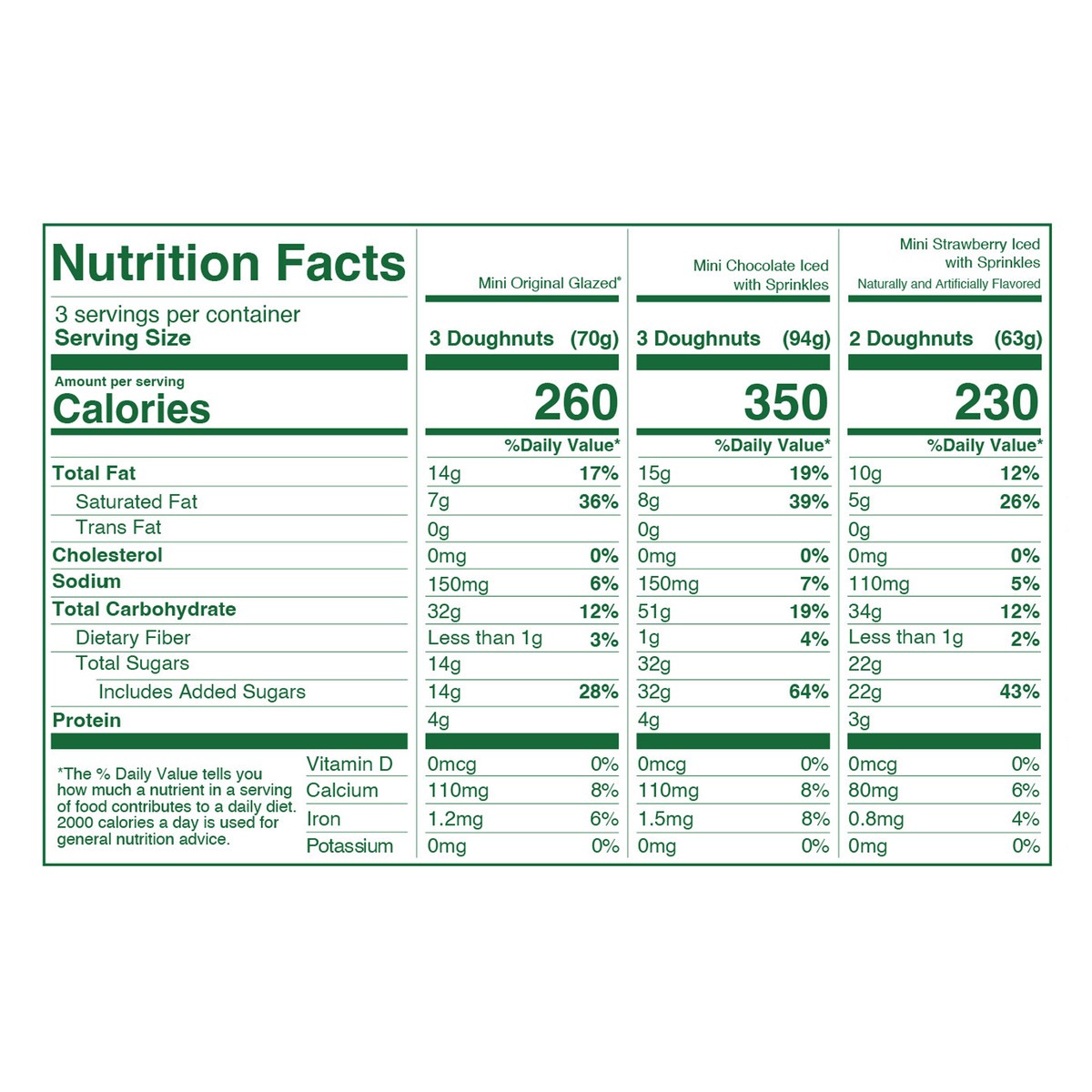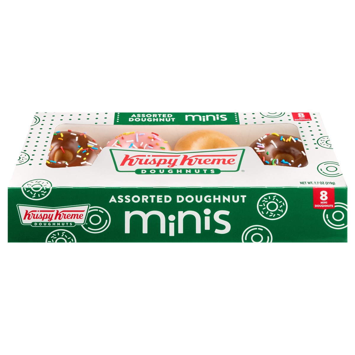 Mini original glazed doughnut : contains: wheat, soy, egg, milk. our facilities produce products with peanuts, tree nuts, soy, milk, eggs, and wheat. while we take steps to minimize the risks of cross contamination, we cannot guarantee that any of our products are safe to consume for people with peanut, tree nut, soy, milk, egg, or wheat allergies. mini chocolate iced with sprinkles doughnut: contains: wheat, soy, egg, milk. our facilities produce products with peanuts, tree nuts, soy, milk, eggs, and wheat. while we take steps to minimize the risks of cross contamination, we cannot guarantee that any of our products are safe to consume for people with peanut, tree nut, soy, milk, egg, or wheat allergies. mini strawberry iced with sprinkles doughnut: contains: wheat, soy, egg, milk. our facilities produce products with peanuts, tree nuts, soy, milk, eggs, and wheat. while we take steps to minimize the risks of cross contamination, we cannot guarantee that any of our products are safe to consume for people with peanut, tree nut, soy, milk, egg, or wheat allergies.