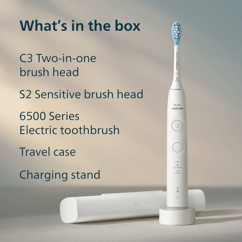 - Includes 1 - 6500 Series electric toothbrush, 1 - C3 Plaque & Whitening brush head, 1 - S2 Sensitive brush head, 1 - travel case, 1 - charging stand (power adaptor not included), 2 year limited warranty