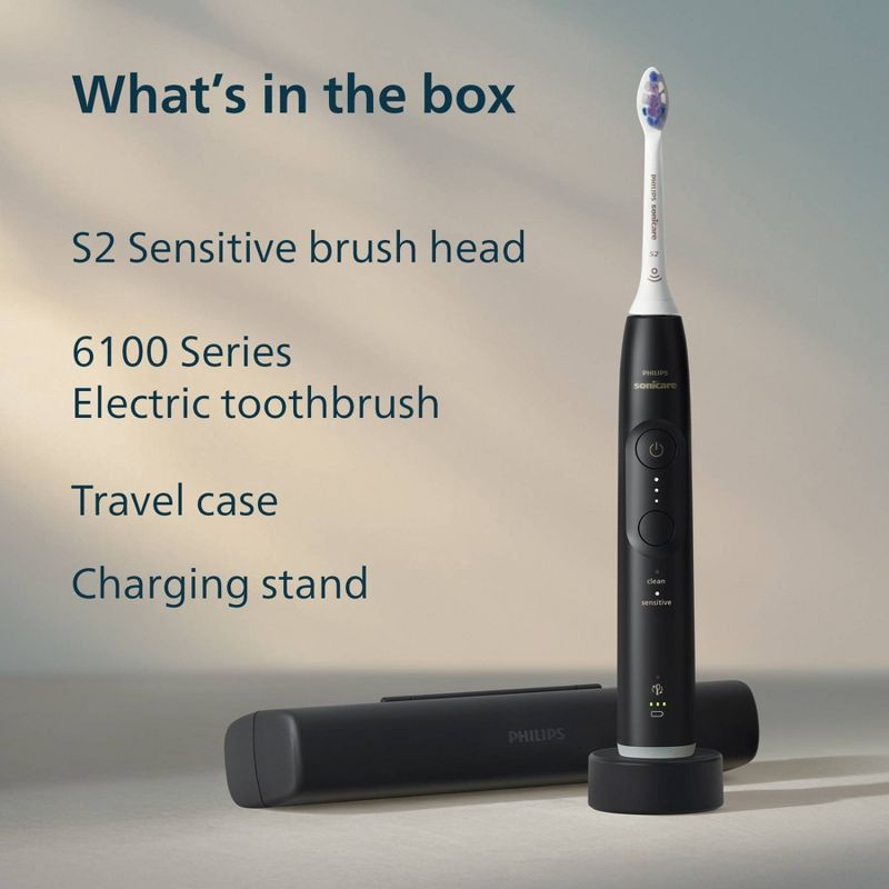 - Includes 1 - 6100 Series electric toothbrush, 1 - S2 Sensitive brush head, 1 - travel case, 1 - charging stand (power adaptor not included), 2 year limited warranty