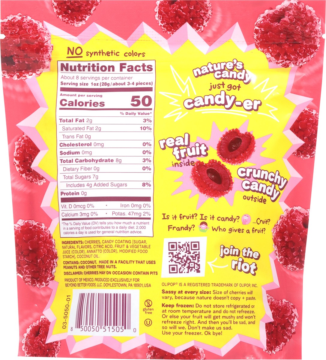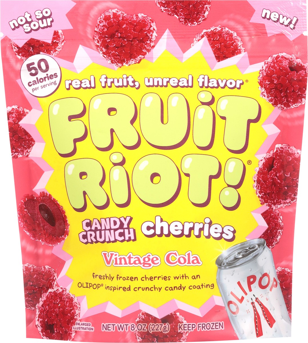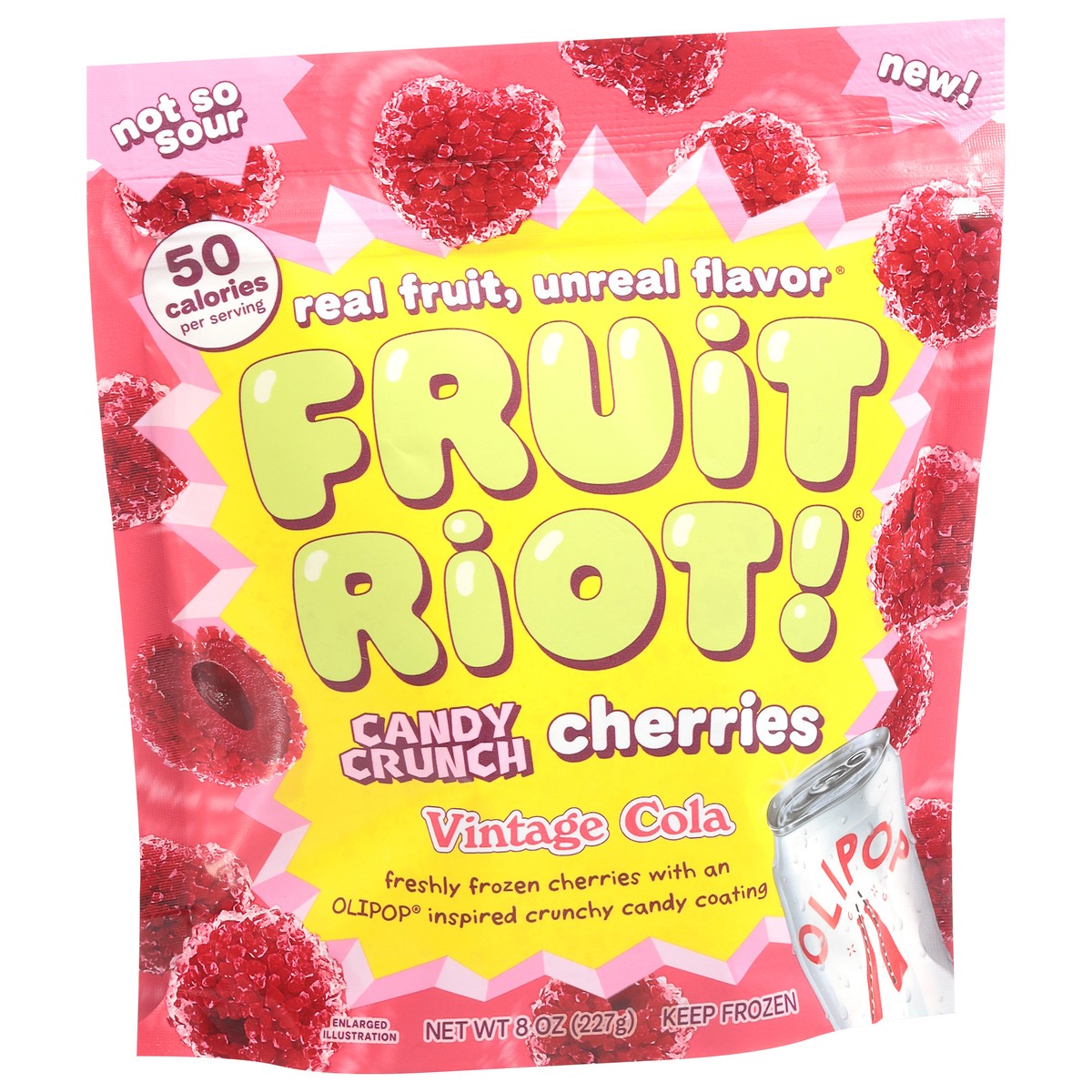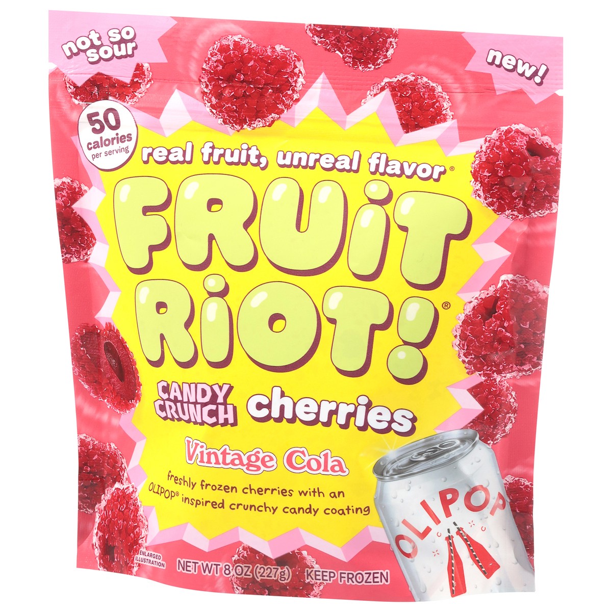 Real fruit. Unreal flavor. Try Fruit Riot! candy crunch cherries for a treat that can't be beat. These freshly frozen cherries have an Olipop Vintage Cola-inspired crunchy candy coating.• Frozen cherr…