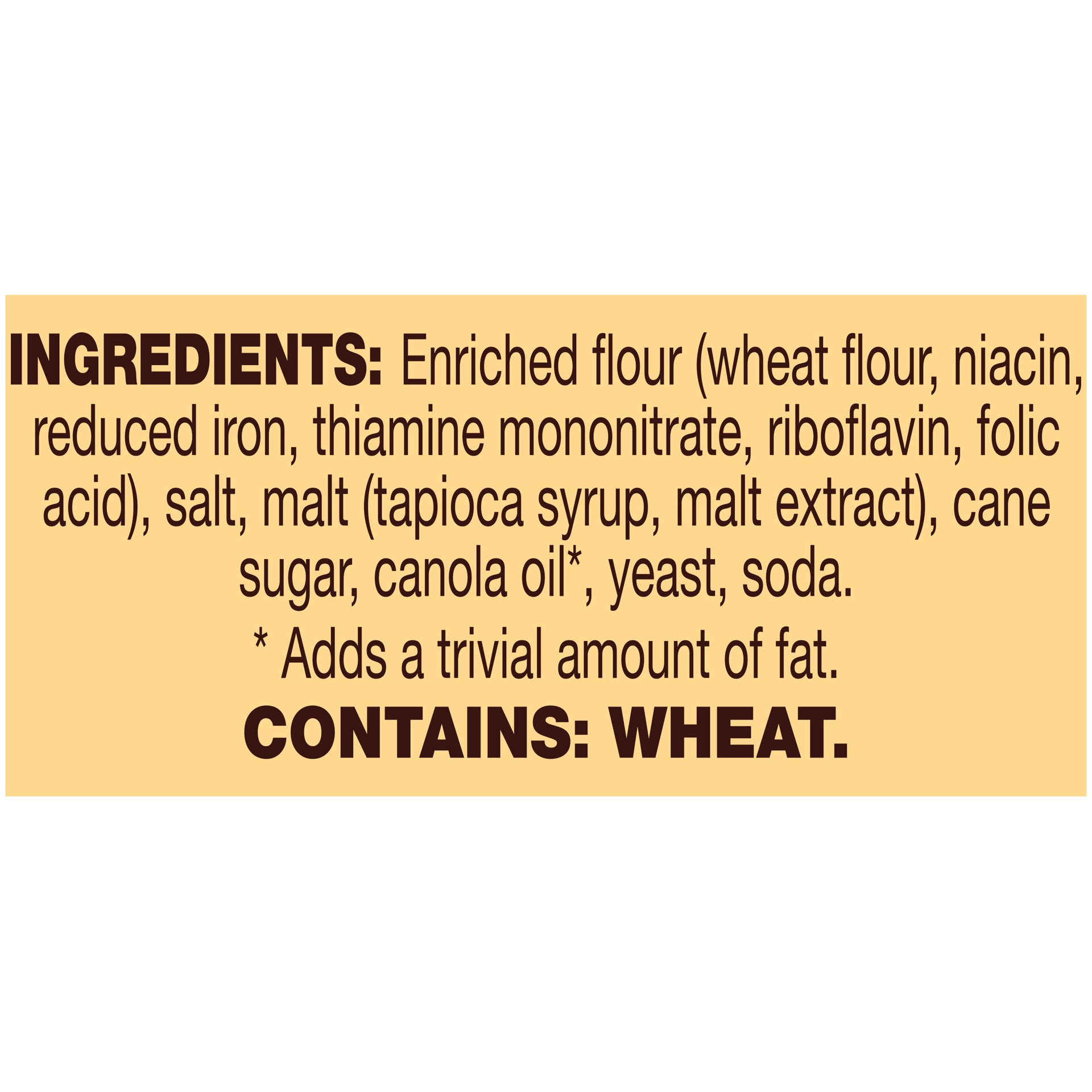 INGREDIENTS: ENRICHED FLOUR (WHEAT FLOUR, NIACIN, REDUCED IRON, THIAMINE MONONITRATE, RIBOFLAVIN, FOLIC ACID), TAPIOCA MALT SYRUP (TAPIOCA SYRUP, MALT EXTRACT), SALT, VEGETABLE OIL (CANOLA, PALM, SOYB…