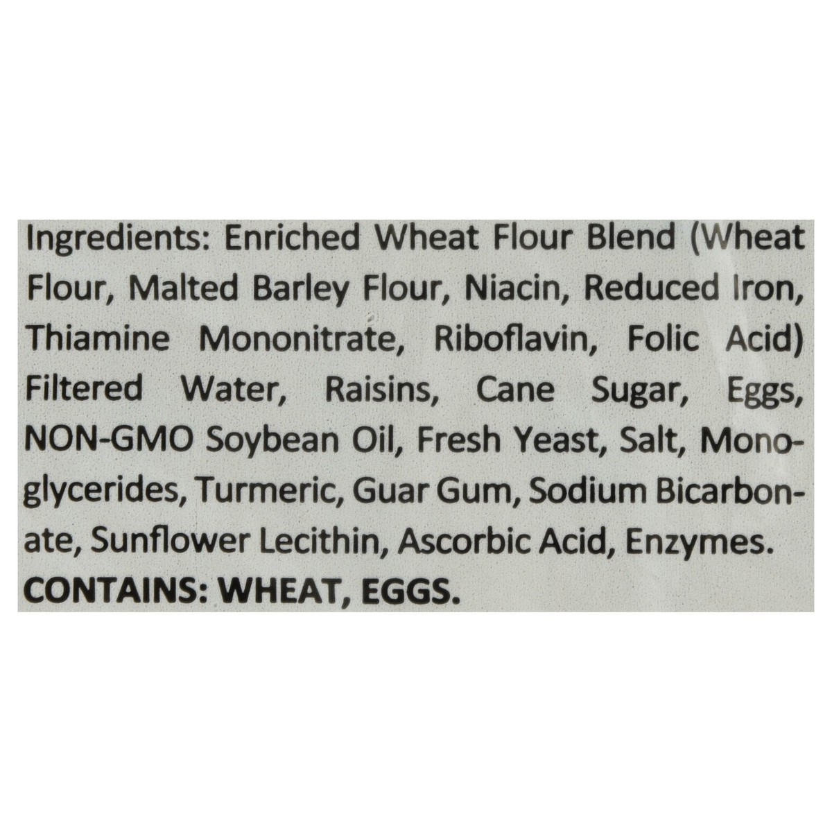 Enriched Wheat Flour Blend (Wheat Flour, Malted Barley Flour, Niacin, Reduced Iron, Thiamine Mononitrate, Riboflavin, Folic Acid) Filtered Water, Raisins, Cane Sugar, Eggs, Non-GMO Soybean Oil, Fresh …