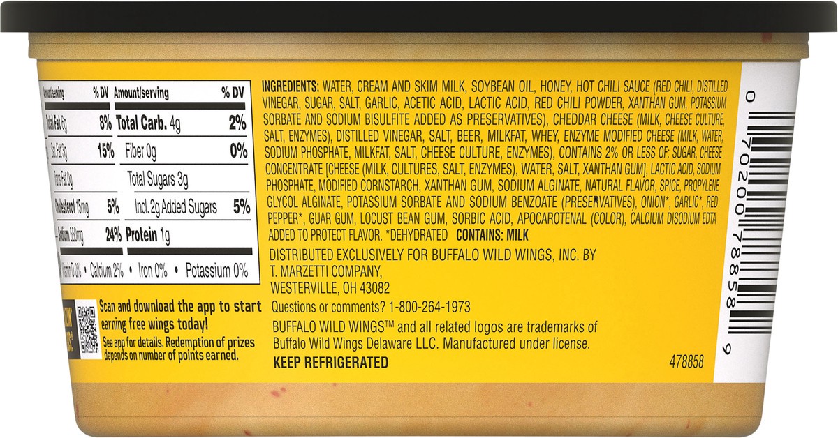 Enjoy delicious pub cheese flavors at home with our Buffalo Wild Wings Spicy Beer Cheese Dip. Made with cheddar cheese, beer, hot chili sauce and honey, our Spicy Beer Cheese Dip satisfies any tailgat…