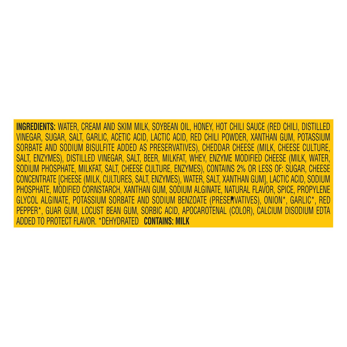 Water, Cream and Skim Milk, Soybean Oil, Honey, Hot Chili Sauce (Red Chili, Distilled Vinegar, Sugar, Salt, Garlic, Acetic Acid, Lactic Acid, Red Chili Powder, Xanthan Gum, Potassium Sorbate and Sodiu…