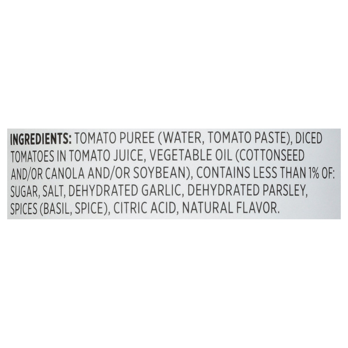 Tomato Puree (Water, Tomato Paste), Diced Tomatoes in Tomato Juice, Vegetable Oil (Cottonseed and/or Canola and/or Soybean), Contains Less than 1% of: Sugar, Salt, Dehydrated Garlic, Dehydrated Parsle…
