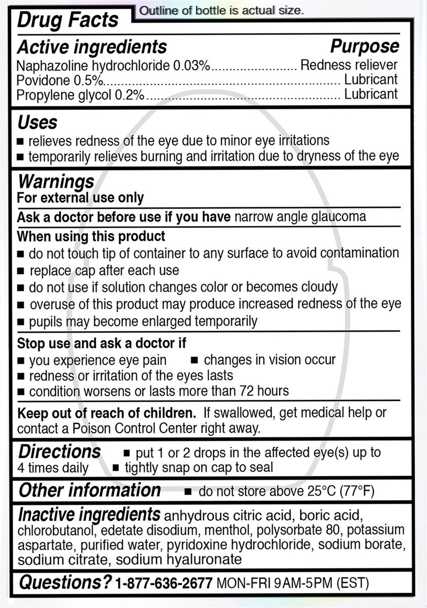 Active Ingredients: Naphazoline Hydrochloride (0.03 %), Redness Reliever; Povidone (0.5 %), Lubricant; Propylene Glycol (0.2 %), Lubricant. Inactive Ingredients: Anhydrous Citric Acid, Boric Acid, Chl…